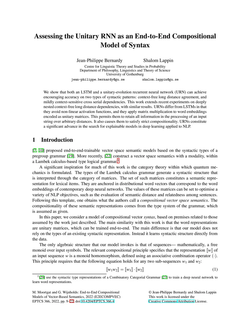 We show that both an LSTM and a unitary-evolution recurrent neural network (URN) can achieve encouraging accuracy on two types of syntactic patterns: context-free long distance agreement, and mildly context-sensitive cross serial dependencies. This work extends recent experiments on deeply nested context-free long distance dependencies, with similar results. URNs differ from LSTMs in that they avoid non-linear activation functions, and they apply matrix multiplication to word embeddings encoded as unitary matrices. This permits them to retain all information in the processing of an input string over arbitrary distances. It also causes them to satisfy strict compositionality. URNs constitute a significant advance in the search for explainable models in deep learning applied to NLP.
