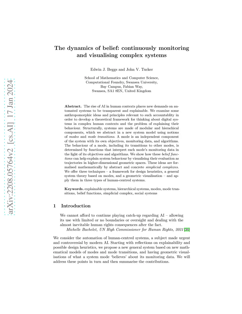 The rise of AI in human contexts places new demands on automated systems to be transparent and explainable. We examine some anthropomorphic ideas and principles relevant to such accountablity in order to develop a theoretical framework for thinking about digital systems in complex human contexts and the problem of explaining their behaviour. Structurally, systems are made of modular and hierachical components, which we abstract in a new system model using notions of modes and mode transitions. A mode is an independent component of the system with its own objectives, monitoring data, and algorithms. The behaviour of a mode, including its transitions to other modes, is determined by functions that interpret each mode's monitoring data in the light of its objectives and algorithms. We show how these belief functions can help explain system behaviour by visualising their evaluation as trajectories in higher-dimensional geometric spaces. These ideas are formalised mathematically by abstract and concrete simplicial complexes. We offer three techniques: a framework for design heuristics, a general system theory based on modes, and a geometric visualisation, and apply them in three types of human-centred systems.