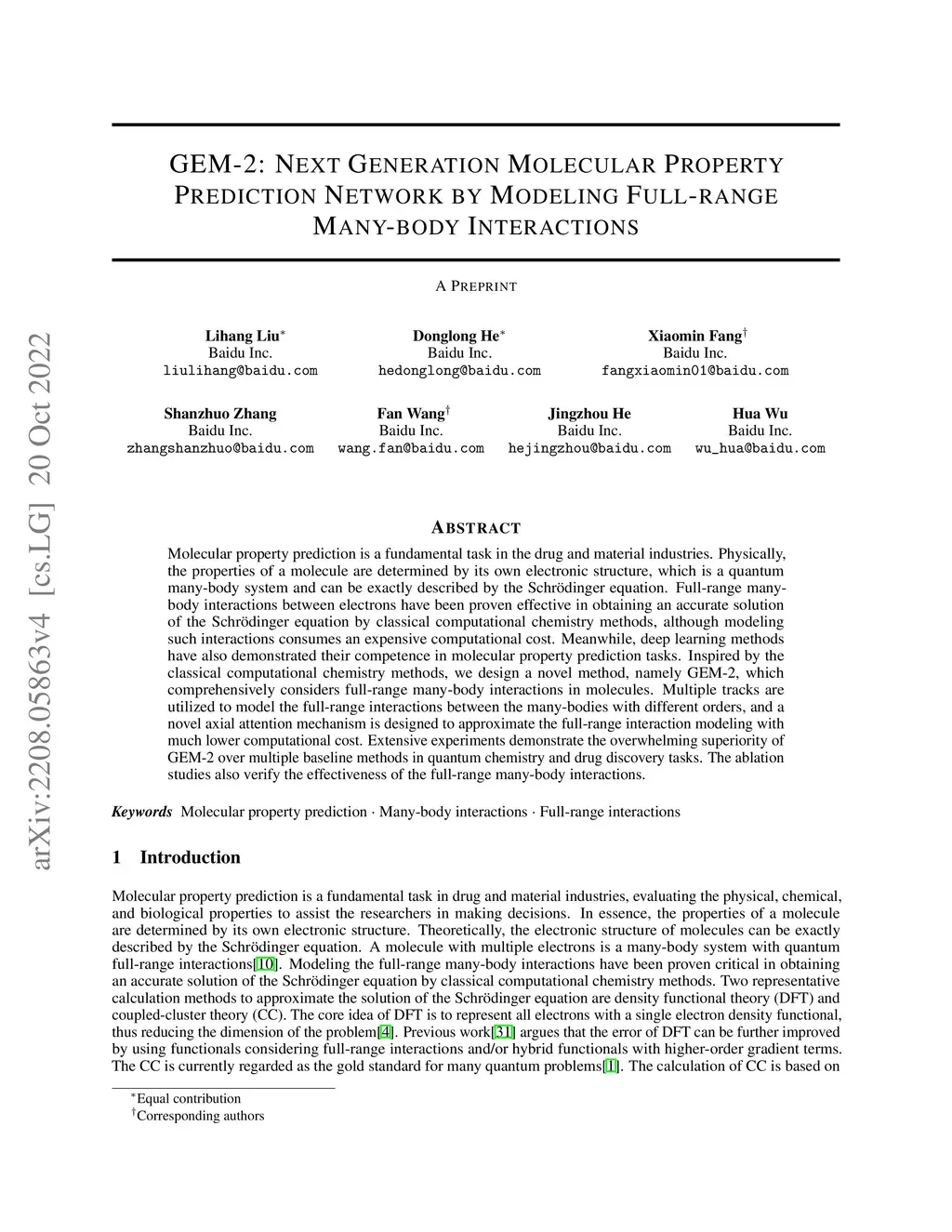 Molecular property prediction is a fundamental task in the drug and material industries. Physically, the properties of a molecule are determined by its own electronic structure, which is a quantum many-body system and can be exactly described by the Schr"odinger equation. Full-range many-body interactions between electrons have been proven effective in obtaining an accurate solution of the Schr"odinger equation by classical computational chemistry methods, although modeling such interactions consumes an expensive computational cost. Meanwhile, deep learning methods have also demonstrated their competence in molecular property prediction tasks. Inspired by the classical computational chemistry methods, we design a novel method, namely GEM-2, which comprehensively considers full-range many-body interactions in molecules. Multiple tracks are utilized to model the full-range interactions between the many-bodies with different orders, and a novel axial attention mechanism is designed to approximate the full-range interaction modeling with much lower computational cost. Extensive experiments demonstrate the overwhelming superiority of GEM-2 over multiple baseline methods in quantum chemistry and drug discovery tasks. The ablation studies also verify the effectiveness of the full-range many-body interactions.