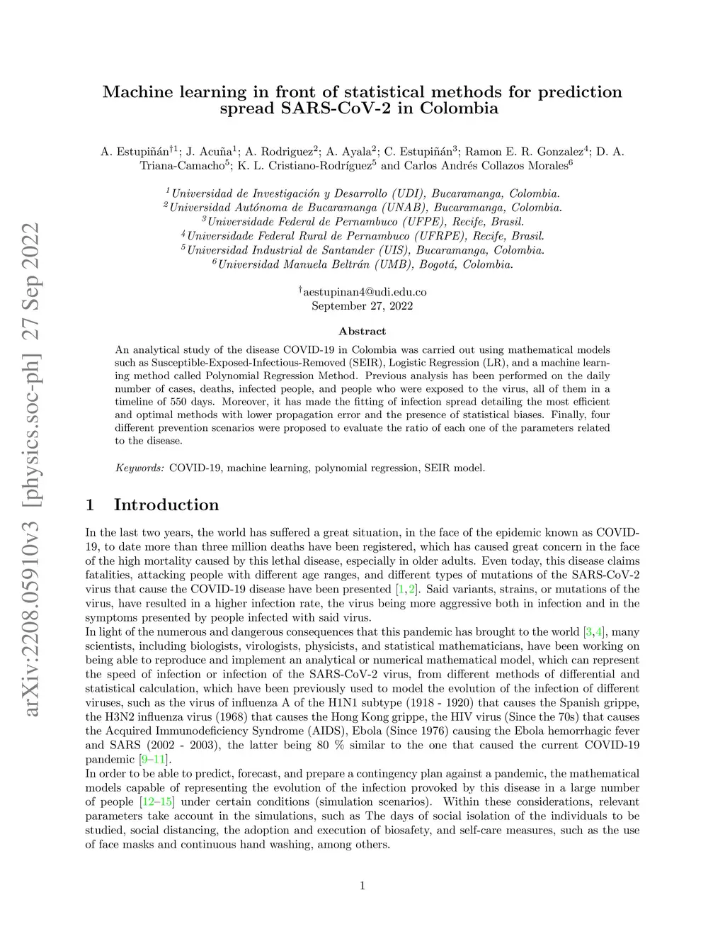 An analytical study of the disease COVID-19 in Colombia was carried out using mathematical models such as Susceptible-Exposed-Infectious-Removed (SEIR), Logistic Regression (LR), and a machine learning method called Polynomial Regression Method. Previous analysis has been performed on the daily number of cases, deaths, infected people, and people who were exposed to the virus, all of them in a timeline of 550 days. Moreover, it has made the fitting of infection spread detailing the most efficient and optimal methods with lower propagation error and the presence of statistical biases. Finally, four different prevention scenarios were proposed to evaluate the ratio of each one of the parameters related to the disease.