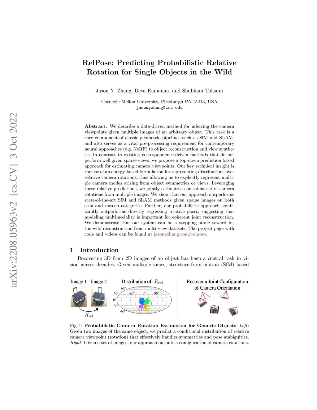 We describe a data-driven method for inferring the camera viewpoints given multiple images of an arbitrary object. This task is a core component of classic geometric pipelines such as SfM and SLAM, and also serves as a vital pre-processing requirement for contemporary neural approaches (e.g. NeRF) to object reconstruction and view synthesis. In contrast to existing correspondence-driven methods that do not perform well given sparse views, we propose a top-down prediction based approach for estimating camera viewpoints. Our key technical insight is the use of an energy-based formulation for representing distributions over relative camera rotations, thus allowing us to explicitly represent multiple camera modes arising from object symmetries or views. Leveraging these relative predictions, we jointly estimate a consistent set of camera rotations from multiple images. We show that our approach outperforms state-of-the-art SfM and SLAM methods given sparse images on both seen and unseen categories. Further, our probabilistic approach significantly outperforms directly regressing relative poses, suggesting that modeling multimodality is important for coherent joint reconstruction. We demonstrate that our system can be a stepping stone toward in-the-wild reconstruction from multi-view datasets. The project page with code and videos can be found at https://jasonyzhang.com/relpose.