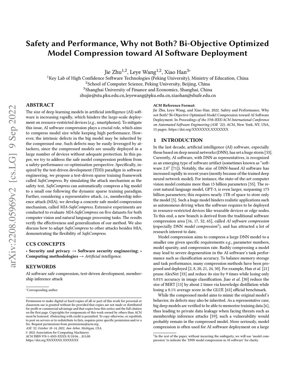 The size of deep learning models in artificial intelligence (AI) software is increasing rapidly, which hinders the large-scale deployment on resource-restricted devices (e.g., smartphones). To mitigate this issue, AI software compression plays a crucial role, which aims to compress model size while keeping high performance. However, the intrinsic defects in the big model may be inherited by the compressed one. Such defects may be easily leveraged by attackers, since the compressed models are usually deployed in a large number of devices without adequate protection. In this paper, we try to address the safe model compression problem from a safety-performance co-optimization perspective. Specifically, inspired by the test-driven development (TDD) paradigm in software engineering, we propose a test-driven sparse training framework called SafeCompress. By simulating the attack mechanism as the safety test, SafeCompress can automatically compress a big model to a small one following the dynamic sparse training paradigm. Further, considering a representative attack, i.e., membership inference attack (MIA), we develop a concrete safe model compression mechanism, called MIA-SafeCompress. Extensive experiments are conducted to evaluate MIA-SafeCompress on five datasets for both computer vision and natural language processing tasks. The results verify the effectiveness and generalization of our method. We also discuss how to adapt SafeCompress to other attacks besides MIA, demonstrating the flexibility of SafeCompress.
