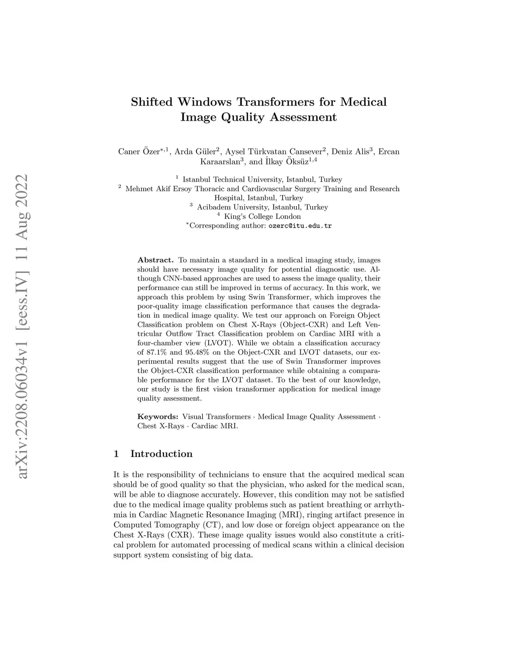 To maintain a standard in a medical imaging study, images should have necessary image quality for potential diagnostic use. Although CNN-based approaches are used to assess the image quality, their performance can still be improved in terms of accuracy. In this work, we approach this problem by using Swin Transformer, which improves the poor-quality image classification performance that causes the degradation in medical image quality. We test our approach on Foreign Object Classification problem on Chest X-Rays (Object-CXR) and Left Ventricular Outflow Tract Classification problem on Cardiac MRI with a four-chamber view (LVOT). While we obtain a classification accuracy of 87.1% and 95.48% on the Object-CXR and LVOT datasets, our experimental results suggest that the use of Swin Transformer improves the Object-CXR classification performance while obtaining a comparable performance for the LVOT dataset. To the best of our knowledge, our study is the first vision transformer application for medical image quality assessment.