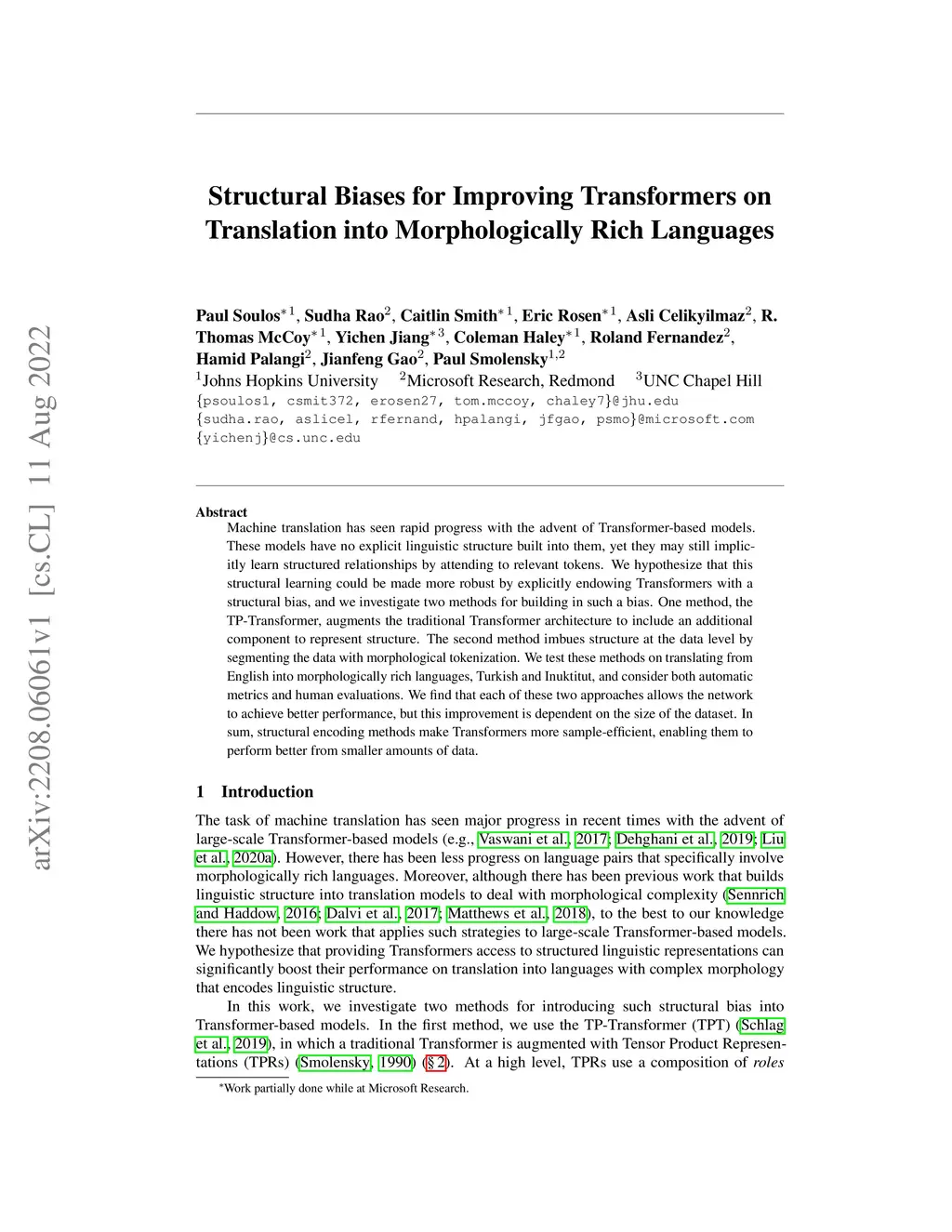 Machine translation has seen rapid progress with the advent of Transformer-based models. These models have no explicit linguistic structure built into them, yet they may still implicitly learn structured relationships by attending to relevant tokens. We hypothesize that this structural learning could be made more robust by explicitly endowing Transformers with a structural bias, and we investigate two methods for building in such a bias. One method, the TP-Transformer, augments the traditional Transformer architecture to include an additional component to represent structure. The second method imbues structure at the data level by segmenting the data with morphological tokenization. We test these methods on translating from English into morphologically rich languages, Turkish and Inuktitut, and consider both automatic metrics and human evaluations. We find that each of these two approaches allows the network to achieve better performance, but this improvement is dependent on the size of the dataset. In sum, structural encoding methods make Transformers more sample-efficient, enabling them to perform better from smaller amounts of data.