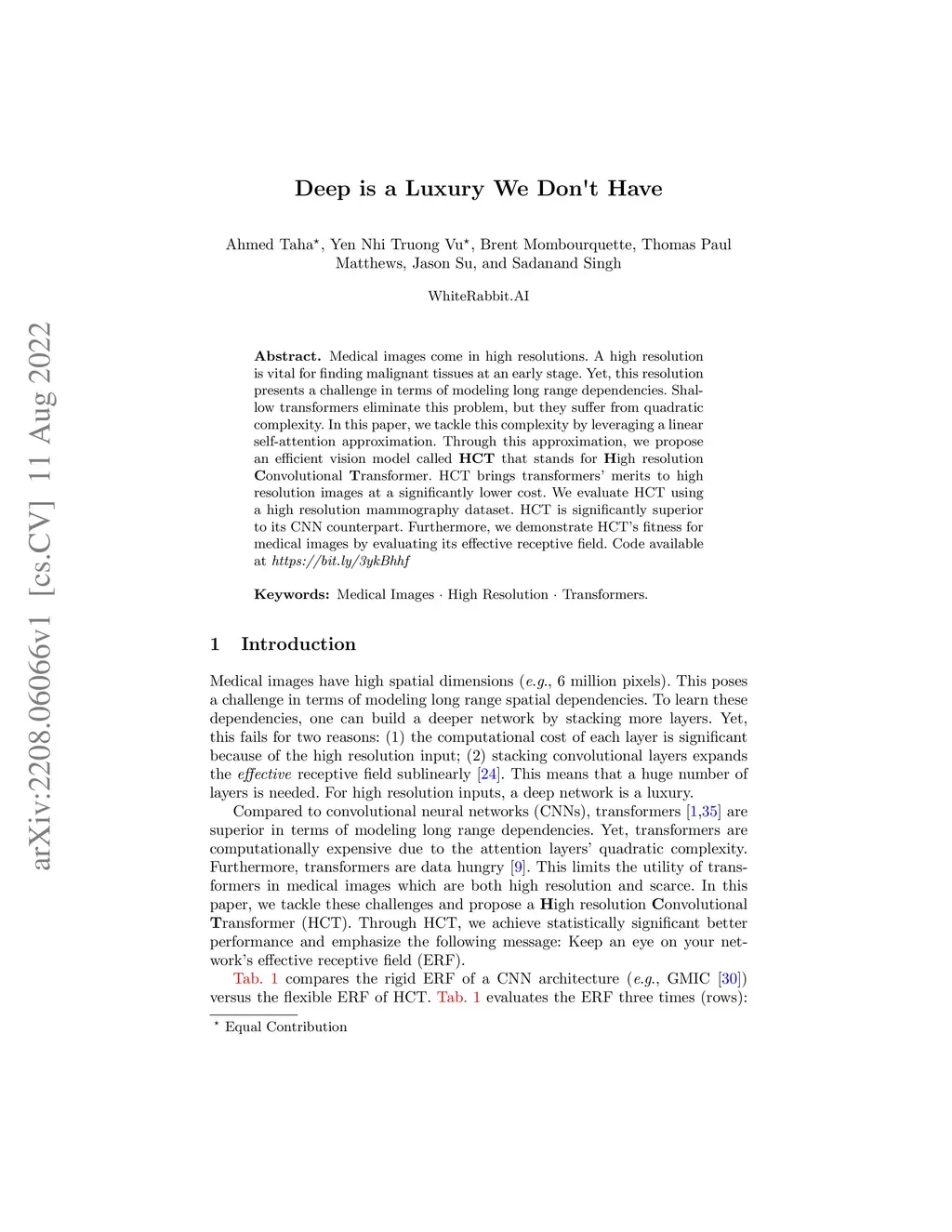 Medical images come in high resolutions. A high resolution is vital for finding malignant tissues at an early stage. Yet, this resolution presents a challenge in terms of modeling long range dependencies. Shallow transformers eliminate this problem, but they suffer from quadratic complexity. In this paper, we tackle this complexity by leveraging a linear self-attention approximation. Through this approximation, we propose an efficient vision model called HCT that stands for High resolution Convolutional Transformer. HCT brings transformers' merits to high resolution images at a significantly lower cost. We evaluate HCT using a high resolution mammography dataset. HCT is significantly superior to its CNN counterpart. Furthermore, we demonstrate HCT's fitness for medical images by evaluating its effective receptive field.Code available at https://bit.ly/3ykBhhf