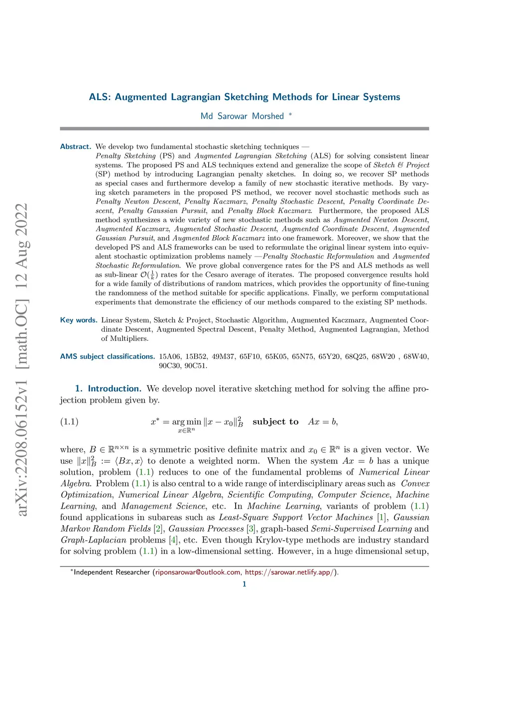 ALS: Augmented Lagrangian Sketching Methods for Linear Systems