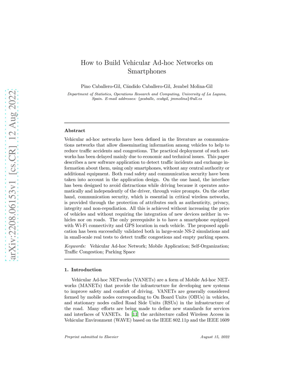 Vehicular ad-hoc networks have been defined in the literature as communications networks that allow disseminating information among vehicles to help to reduce traffic accidents and congestions. The practical deployment of such networks has been delayed mainly due to economic and technical issues. This paper describes a new software application to detect traffic incidents and exchange information about them, using only smartphones, without any central authority or additional equipment. Both road safety and communication security have been taken into account in the application design. On the one hand, the interface has been designed to avoid distractions while driving because it operates automatically and independently of the driver, through voice prompts. On the other hand, communication security, which is essential in critical wireless networks, is provided through the protection of attributes such as authenticity, privacy, integrity and non-repudiation. All this is achieved without increasing the price of vehicles and without requiring the integration of new devices neither in vehicles nor on roads. The only prerequisite is to have a smartphone equipped with Wi-Fi connectivity and GPS location in each vehicle. The proposed application has been successfully validated both in large-scale NS-2 simulations and in small-scale real tests to detect traffic congestions and empty parking spaces.