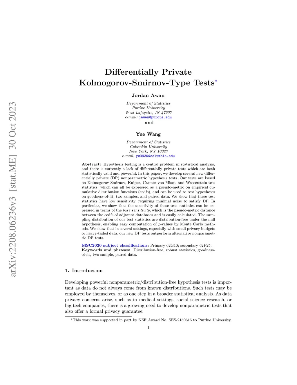 Hypothesis testing is a central problem in statistical analysis, and there is currently a lack of differentially private tests which are both statistically valid and powerful. In this paper, we develop several new differentially private (DP) nonparametric hypothesis tests. Our tests are based on Kolmogorov-Smirnov, Kuiper, Cram\ér-von Mises, and Wasserstein test statistics, which can all be expressed as a pseudo-metric on empirical cumulative distribution functions (ecdfs), and can be used to test hypotheses on goodness-of-fit, two samples, and paired data. We show that these test statistics have low sensitivity, requiring minimal noise to satisfy DP. In particular, we show that the sensitivity of these test statistics can be expressed in terms of the base sensitivity, which is the pseudo-metric distance between the ecdfs of adjacent databases and is easily calculated. The sampling distribution of our test statistics are distribution-free under the null hypothesis, enabling easy computation of -values by Monte Carlo methods. We show that in several settings, especially with small privacy budgets or heavy-tailed data, our new DP tests outperform alternative nonparametric DP tests.