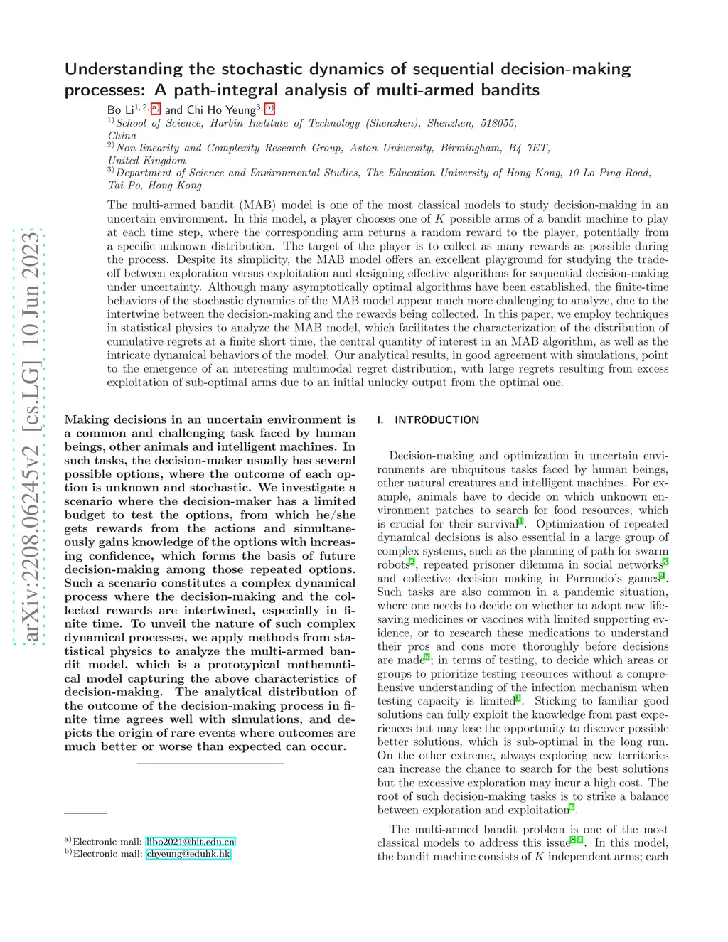 The multi-armed bandit (MAB) model is one of the most classical models to study decision-making in an uncertain environment. In this model, a player chooses one of possible arms of a bandit machine to play at each time step, where the corresponding arm returns a random reward to the player, potentially from a specific unknown distribution. The target of the player is to collect as many rewards as possible during the process. Despite its simplicity, the MAB model offers an excellent playground for studying the trade-off between exploration versus exploitation and designing effective algorithms for sequential decision-making under uncertainty. Although many asymptotically optimal algorithms have been established, the finite-time behaviors of the stochastic dynamics of the MAB model appear much more challenging to analyze, due to the intertwine between the decision-making and the rewards being collected. In this paper, we employ techniques in statistical physics to analyze the MAB model, which facilitates the characterization of the distribution of cumulative regrets at a finite short time, the central quantity of interest in an MAB algorithm, as well as the intricate dynamical behaviors of the model. Our analytical results, in good agreement with simulations, point to the emergence of an interesting multimodal regret distribution, with large regrets resulting from excess exploitation of sub-optimal arms due to an initial unlucky output from the optimal one.