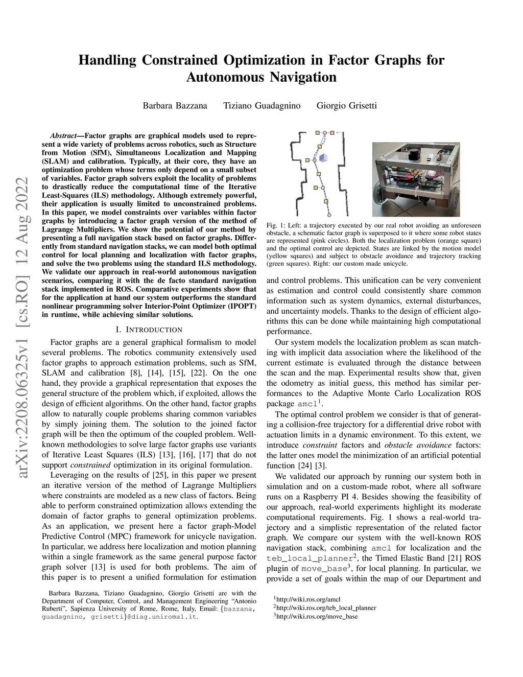 Factor graphs are graphical models used to represent a wide variety of problems across robotics, such as Structure from Motion (SfM), Simultaneous Localization and Mapping (SLAM) and calibration. Typically, at their core, they have an optimization problem whose terms only depend on a small subset of variables. Factor graph solvers exploit the locality of problems to drastically reduce the computational time of the Iterative Least-Squares (ILS) methodology. Although extremely powerful, their application is usually limited to unconstrained problems. In this paper, we model constraints over variables within factor graphs by introducing a factor graph version of the method of Lagrange Multipliers. We show the potential of our method by presenting a full navigation stack based on factor graphs. Differently from standard navigation stacks, we can model both optimal control for local planning and localization with factor graphs, and solve the two problems using the standard ILS methodology. We validate our approach in real-world autonomous navigation scenarios, comparing it with the de facto standard navigation stack implemented in ROS. Comparative experiments show that for the application at hand our system outperforms the standard nonlinear programming solver Interior-Point Optimizer (IPOPT) in runtime, while achieving similar solutions.