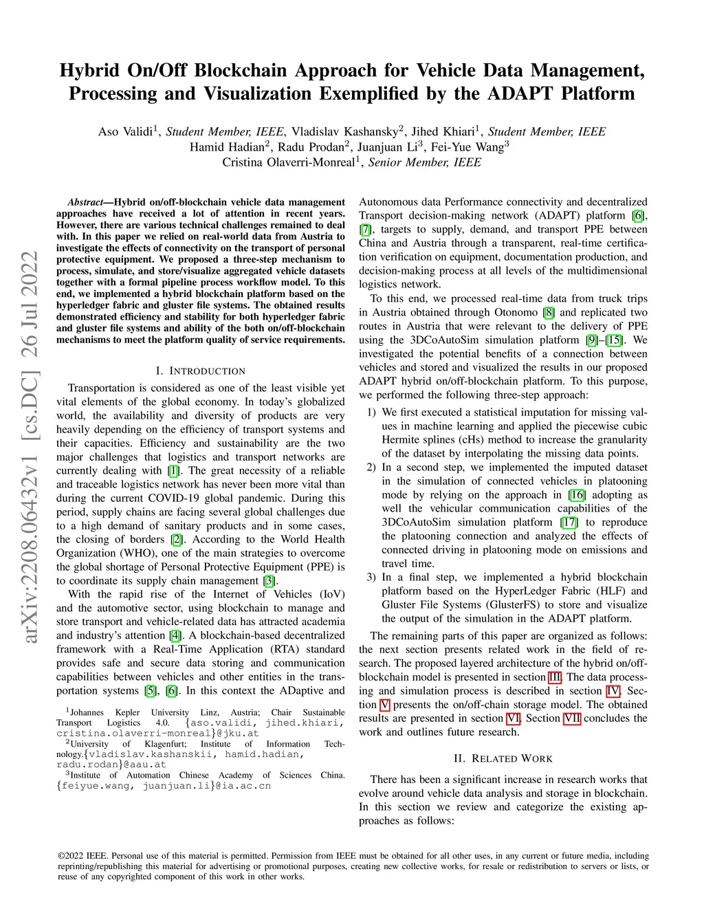 Hybrid on/off-blockchain vehicle data management approaches have received a lot of attention in recent years. However, there are various technical challenges remained to deal with. In this paper we relied on real-world data from Austria to investigate the effects of connectivity on the transport of personal protective equipment. We proposed a three-step mechanism to process, simulate, and store/visualize aggregated vehicle datasets together with a formal pipeline process workflow model. To this end, we implemented a hybrid blockchain platform based on the hyperledger fabric and gluster file systems. The obtained results demonstrated efficiency and stability for both hyperledger fabric and gluster file systems and ability of the both on/off-blockchain mechanisms to meet the platform quality of service requirements