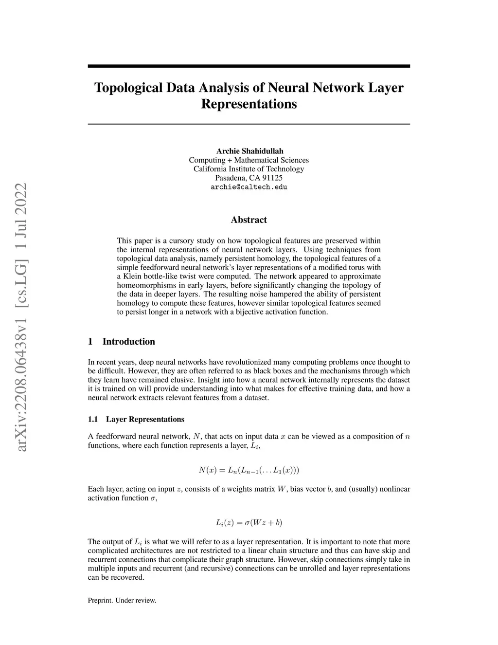 This paper is a cursory study on how topological features are preserved within the internal representations of neural network layers. Using techniques from topological data analysis, namely persistent homology, the topological features of a simple feedforward neural network's layer representations of a modified torus with a Klein bottle-like twist were computed. The network appeared to approximate homeomorphisms in early layers, before significantly changing the topology of the data in deeper layers. The resulting noise hampered the ability of persistent homology to compute these features, however similar topological features seemed to persist longer in a network with a bijective activation function.