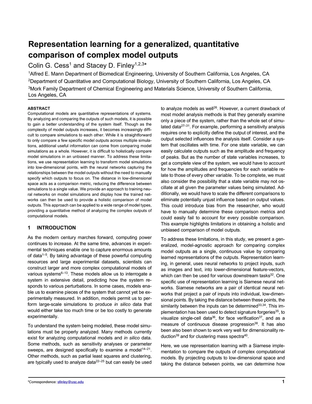 Computational models are quantitative representations of systems. By analyzing and comparing the outputs of such models, it is possible to gain a better understanding of the system itself. Though as the complexity of model outputs increases, it becomes increasingly difficult to compare simulations to each other. While it is straightforward to only compare a few specific model outputs across multiple simulations, additional useful information can come from comparing model simulations as a whole. However, it is difficult to holistically compare model simulations in an unbiased manner. To address these limitations, we use representation learning to transform model simulations into low-dimensional points, with the neural networks capturing the relationships between the model outputs without the need to manually specify which outputs to focus on. The distance in low-dimensional space acts as a comparison metric, reducing the difference between simulations to a single value. We provide an approach to training neural networks on model simulations and display how the trained networks can then be used to provide a holistic comparison of model outputs. This approach can be applied to a wide range of model types, providing a quantitative method of analyzing the complex outputs of computational models.