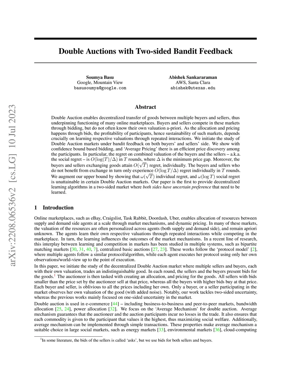 Double Auction enables decentralized transfer of goods between multiple buyers and sellers, thus underpinning functioning of many online marketplaces. Buyers and sellers compete in these markets through bidding, but do not often know their own valuation a-priori. As the allocation and pricing happens through bids, the profitability of participants, hence sustainability of such markets, depends crucially on learning respective valuations through repeated interactions. We initiate the study of Double Auction markets under bandit feedback on both buyers' and sellers' side. We show with confidence bound based bidding, and `Average Pricing' there is an efficient price discovery among the participants. In particular, the regret on combined valuation of the buyers and the sellers -- a.k.a. the social regret -- is in rounds, where is the minimum price gap. Moreover, the buyers and sellers exchanging goods attain regret, individually. The buyers and sellers who do not benefit from exchange in turn only experience regret individually in rounds. We augment our upper bound by showing that individual regret, and social regret is unattainable in certain Double Auction markets. Our paper is the first to provide decentralized learning algorithms in a two-sided market where \emph{both sides have uncertain preference} that need to be learned.