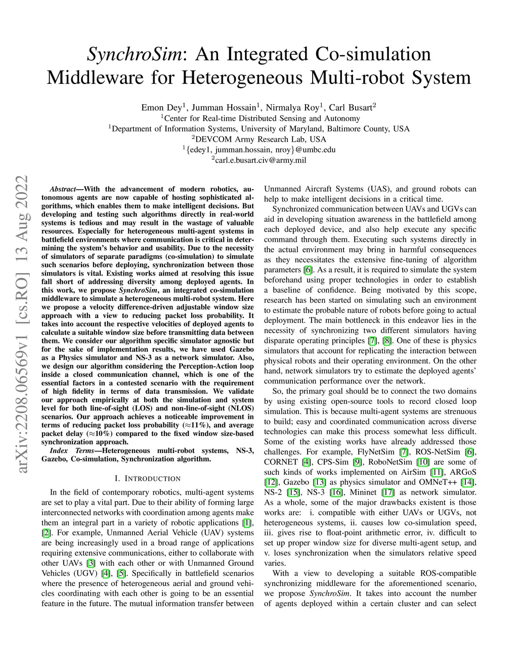 With the advancement of modern robotics, autonomous agents are now capable of hosting sophisticated algorithms, which enables them to make intelligent decisions. But developing and testing such algorithms directly in real-world systems is tedious and may result in the wastage of valuable resources. Especially for heterogeneous multi-agent systems in battlefield environments where communication is critical in determining the system's behavior and usability. Due to the necessity of simulators of separate paradigms (co-simulation) to simulate such scenarios before deploying, synchronization between those simulators is vital. Existing works aimed at resolving this issue fall short of addressing diversity among deployed agents. In this work, we propose \textit{SynchroSim}, an integrated co-simulation middleware to simulate a heterogeneous multi-robot system. Here we propose a velocity difference-driven adjustable window size approach with a view to reducing packet loss probability. It takes into account the respective velocities of deployed agents to calculate a suitable window size before transmitting data between them. We consider our algorithm-specific simulator agnostic but for the sake of implementation results, we have used Gazebo as a Physics simulator and NS-3 as a network simulator. Also, we design our algorithm considering the Perception-Action loop inside a closed communication channel, which is one of the essential factors in a contested scenario with the requirement of high fidelity in terms of data transmission. We validate our approach empirically at both the simulation and system level for both line-of-sight (LOS) and non-line-of-sight (NLOS) scenarios. Our approach achieves a noticeable improvement in terms of reducing packet loss probability (11\%), and average packet delay (10\%) compared to the fixed window size-based synchronization approach.