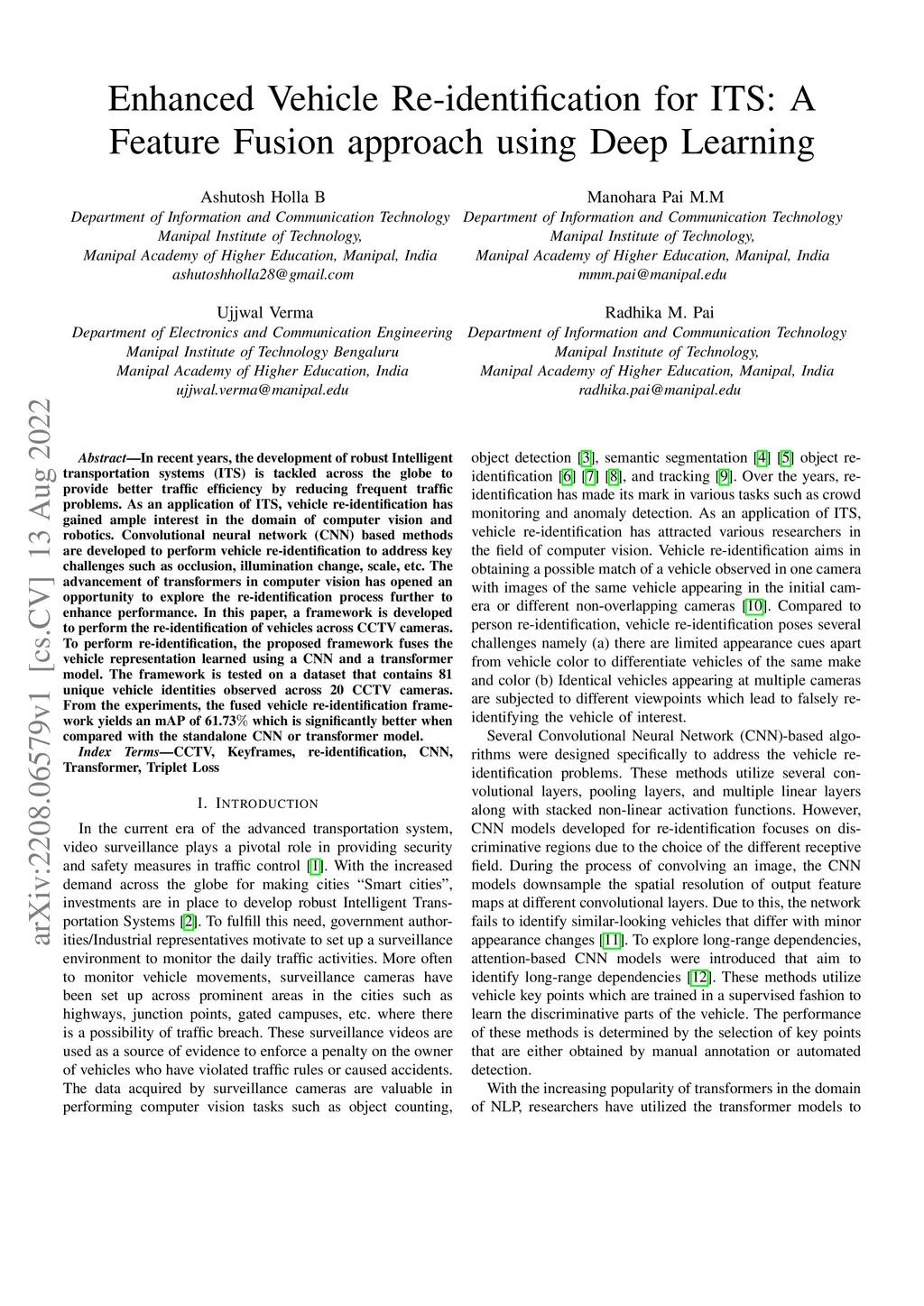 In recent years, the development of robust Intelligent transportation systems (ITS) is tackled across the globe to provide better traffic efficiency by reducing frequent traffic problems. As an application of ITS, vehicle re-identification has gained ample interest in the domain of computer vision and robotics. Convolutional neural network (CNN) based methods are developed to perform vehicle re-identification to address key challenges such as occlusion, illumination change, scale, etc. The advancement of transformers in computer vision has opened an opportunity to explore the re-identification process further to enhance performance. In this paper, a framework is developed to perform the re-identification of vehicles across CCTV cameras. To perform re-identification, the proposed framework fuses the vehicle representation learned using a CNN and a transformer model. The framework is tested on a dataset that contains 81 unique vehicle identities observed across 20 CCTV cameras. From the experiments, the fused vehicle re-identification framework yields an mAP of 61.73% which is significantly better when compared with the standalone CNN or transformer model.