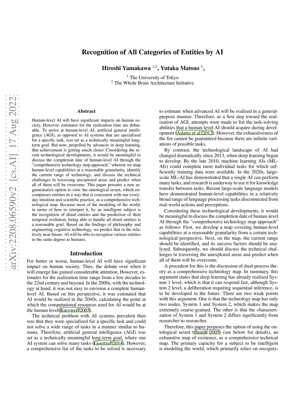 Human-level AI will have significant impacts on human society. However, estimates for the realization time are debatable. To arrive at human-level AI, artificial general intelligence (AGI), as opposed to AI systems that are specialized for a specific task, was set as a technically meaningful long-term goal. But now, propelled by advances in deep learning, that achievement is getting much closer. Considering the recent technological developments, it would be meaningful to discuss the completion date of human-level AI through the "comprehensive technology map approach," wherein we map human-level capabilities at a reasonable granularity, identify the current range of technology, and discuss the technical challenges in traversing unexplored areas and predict when all of them will be overcome. This paper presents a new argumentative option to view the ontological sextet, which encompasses entities in a way that is consistent with our everyday intuition and scientific practice, as a comprehensive technological map. Because most of the modeling of the world, in terms of how to interpret it, by an intelligent subject is the recognition of distal entities and the prediction of their temporal evolution, being able to handle all distal entities is a reasonable goal. Based on the findings of philosophy and engineering cognitive technology, we predict that in the relatively near future, AI will be able to recognize various entities to the same degree as humans.