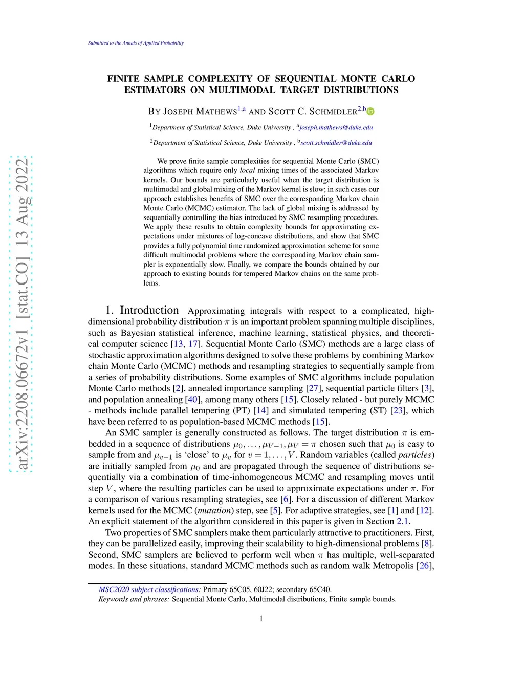 We prove finite sample complexities for sequential Monte Carlo (SMC) algorithms which require only local mixing times of the associated Markov kernels. Our bounds are particularly useful when the target distribution is multimodal and global mixing of the Markov kernel is slow; in such cases our approach establishes the benefits of SMC over the corresponding Markov chain Monte Carlo (MCMC) estimator. The lack of global mixing is addressed by sequentially controlling the bias introduced by SMC resampling procedures. We apply these results to obtain complexity bounds for approximating expectations under mixtures of log-concave distributions and show that SMC provides a fully polynomial time randomized approximation scheme for some difficult multimodal problems where the corresponding Markov chain sampler is exponentially slow. Finally, we compare the bounds obtained by our approach to existing bounds for tempered Markov chains on the same problems.