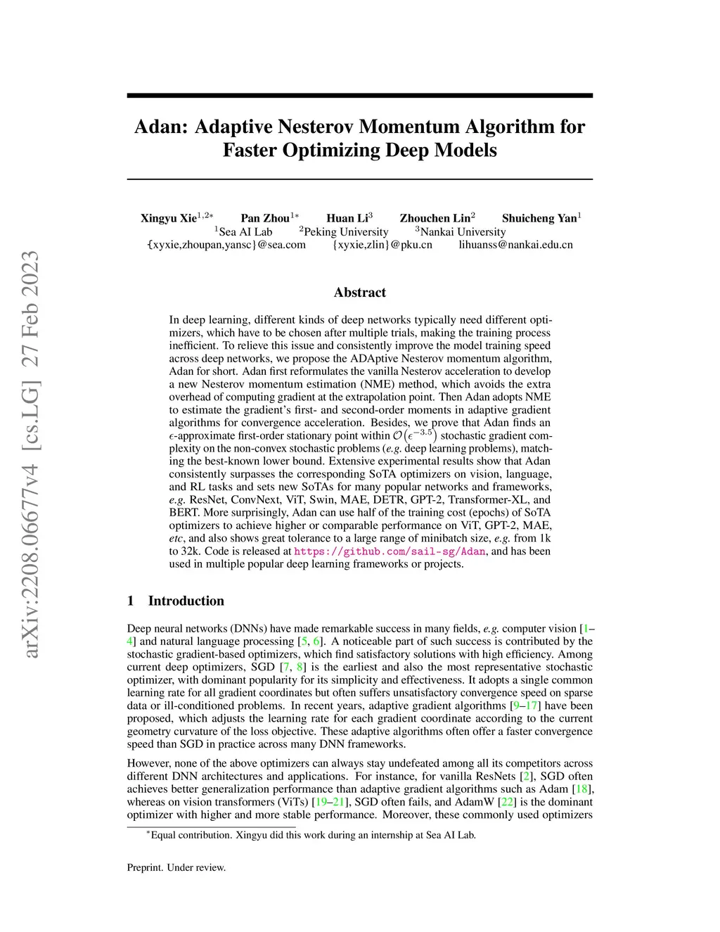 In deep learning, different kinds of deep networks typically need different optimizers, which have to be chosen after multiple trials, making the training process inefficient. To relieve this issue and consistently improve the model training speed across deep networks, we propose the ADAptive Nesterov momentum algorithm, Adan for short. Adan first reformulates the vanilla Nesterov acceleration to develop a new Nesterov momentum estimation (NME) method, which avoids the extra overhead of computing gradient at the extrapolation point. Then Adan adopts NME to estimate the gradient's first- and second-order moments in adaptive gradient algorithms for convergence acceleration. Besides, we prove that Adan finds an -approximate first-order stationary point within stochastic gradient complexity on the non-convex stochastic problems (e.g., deep learning problems), matching the best-known lower bound. Extensive experimental results show that Adan consistently surpasses the corresponding SoTA optimizers on vision, language, and RL tasks and sets new SoTAs for many popular networks and frameworks, e.g., ResNet, ConvNext, ViT, Swin, MAE, DETR, GPT-2, Transformer-XL, and BERT. More surprisingly, Adan can use half of the training cost (epochs) of SoTA optimizers to achieve higher or comparable performance on ViT, GPT-2, MAE, e.t.c., and also shows great tolerance to a large range of minibatch size, e.g., from 1k to 32k. Code is released at https://github.com/sail-sg/Adan, and has been used in multiple popular deep learning frameworks or projects.