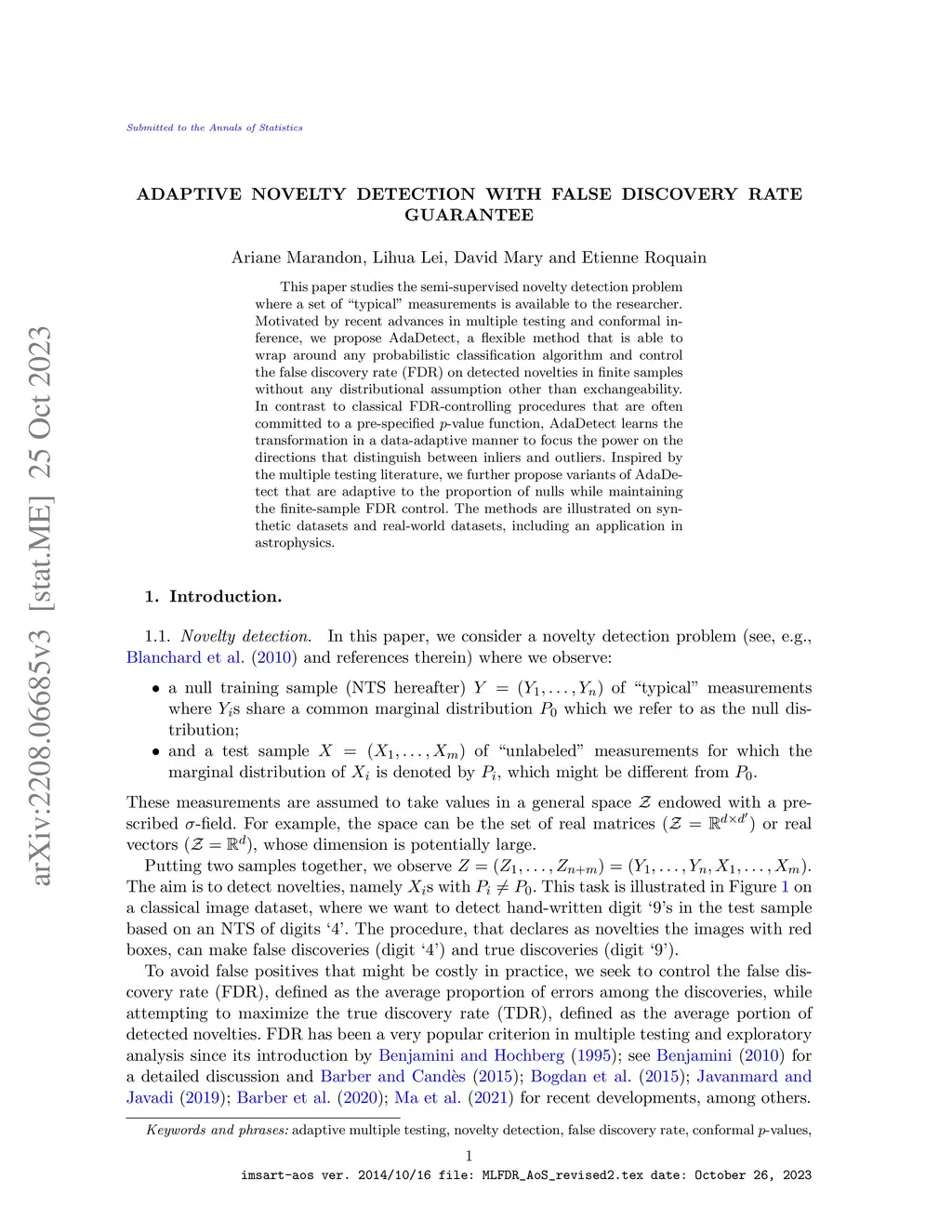This paper studies the semi-supervised novelty detection problem where a set of "typical" measurements is available to the researcher. Motivated by recent advances in multiple testing and conformal inference, we propose AdaDetect, a flexible method that is able to wrap around any probabilistic classification algorithm and control the false discovery rate (FDR) on detected novelties in finite samples without any distributional assumption other than exchangeability. In contrast to classical FDR-controlling procedures that are often committed to a pre-specified p-value function, AdaDetect learns the transformation in a data-adaptive manner to focus the power on the directions that distinguish between inliers and outliers. Inspired by the multiple testing literature, we further propose variants of AdaDetect that are adaptive to the proportion of nulls while maintaining the finite-sample FDR control. The methods are illustrated on synthetic datasets and real-world datasets, including an application in astrophysics.