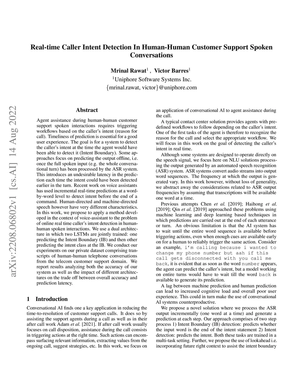 Real-time Caller Intent Detection In Human-Human Customer Support Spoken