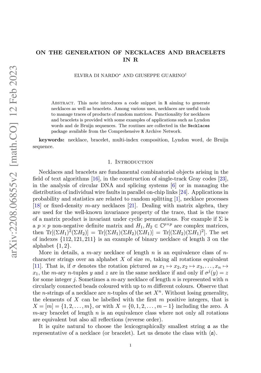 This note introduces a code snippet in R aiming to generate necklaces as well as bracelets. Among various uses, necklaces are useful tools to manage traces of products of random matrices. Functionality for necklaces and bracelets is provided with some examples of applications such as Lyndon words and de Bruijn sequences. The routines are collected in the Necklaces package available from the Comprehensive R Archive Network.