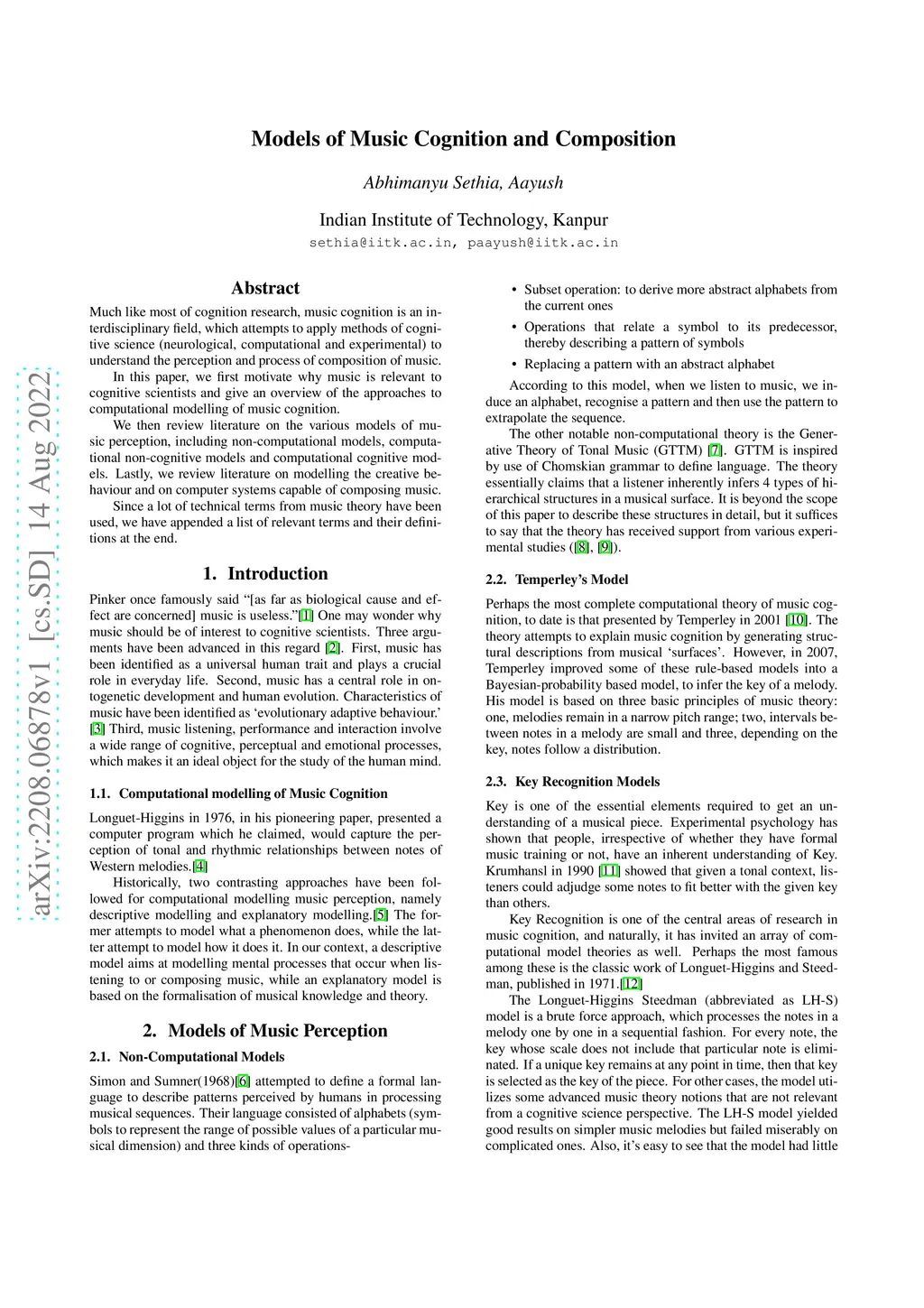 Much like most of cognition research, music cognition is an interdisciplinary field, which attempts to apply methods of cognitive science (neurological, computational and experimental) to understand the perception and process of composition of music. In this paper, we first motivate why music is relevant to cognitive scientists and give an overview of the approaches to computational modelling of music cognition. We then review literature on the various models of music perception, including non-computational models, computational non-cognitive models and computational cognitive models. Lastly, we review literature on modelling the creative behaviour and on computer systems capable of composing music. Since a lot of technical terms from music theory have been used, we have appended a list of relevant terms and their definitions at the end.