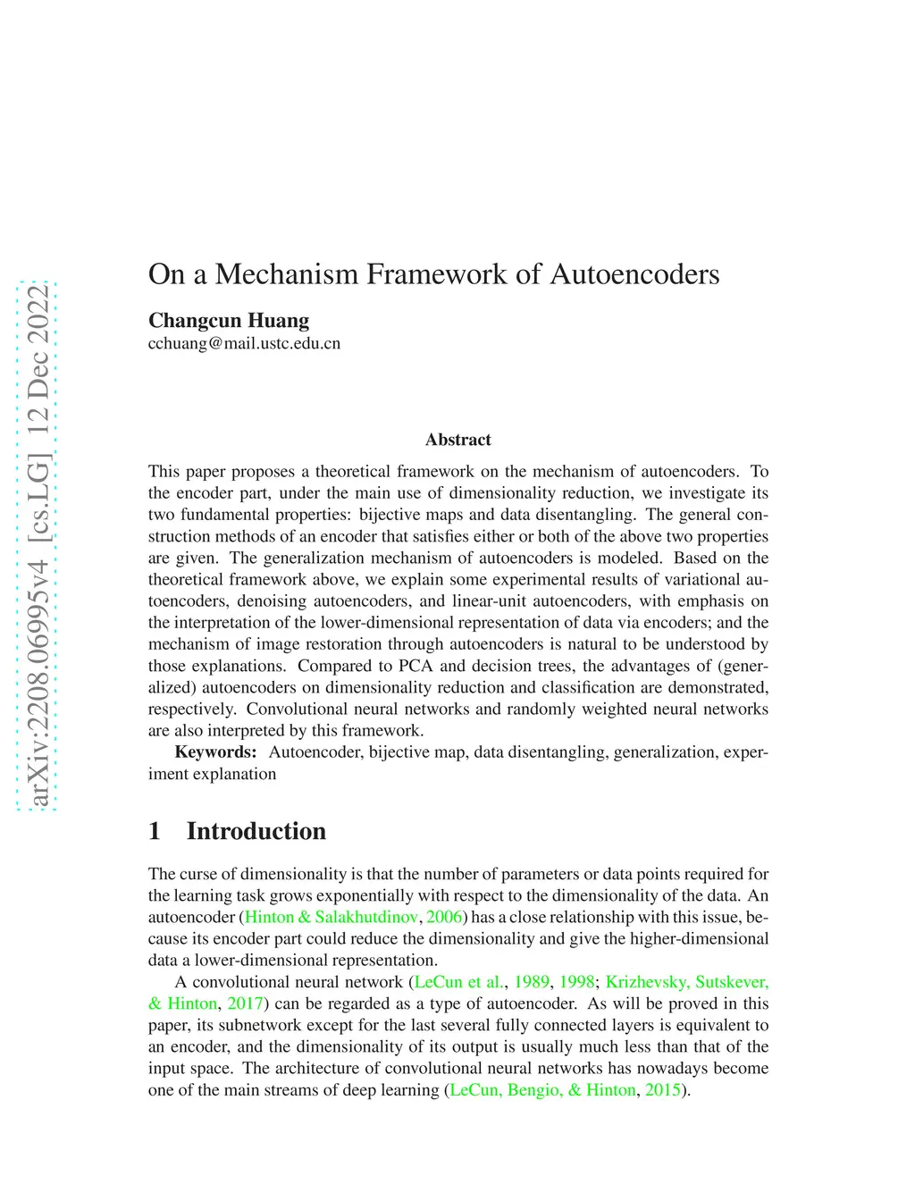 This paper proposes a theoretical framework on the mechanism of autoencoders. To the encoder part, under the main use of dimensionality reduction, we investigate its two fundamental properties: bijective maps and data disentangling. The general construction methods of an encoder that satisfies either or both of the above two properties are given. The generalization mechanism of autoencoders is modeled. Based on the theoretical framework above, we explain some experimental results of variational autoencoders, denoising autoencoders, and linear-unit autoencoders, with emphasis on the interpretation of the lower-dimensional representation of data via encoders; and the mechanism of image restoration through autoencoders is natural to be understood by those explanations. Compared to PCA and decision trees, the advantages of (generalized) autoencoders on dimensionality reduction and classification are demonstrated, respectively. Convolutional neural networks and randomly weighted neural networks are also interpreted by this framework.