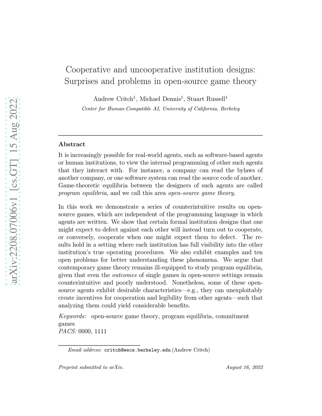 It is increasingly possible for real-world agents, such as software-based agents or human institutions, to view the internal programming of other such agents that they interact with. For instance, a company can read the bylaws of another company, or one software system can read the source code of another. Game-theoretic equilibria between the designers of such agents are called \emph{program equilibria}, and we call this area \emph{open-source game theory}. In this work we demonstrate a series of counterintuitive results on open-source games, which are independent of the programming language in which agents are written. We show that certain formal institution designs that one might expect to defect against each other will instead turn out to cooperate, or conversely, cooperate when one might expect them to defect. The results hold in a setting where each institution has full visibility into the other institution's true operating procedures. We also exhibit examples and ten open problems for better understanding these phenomena. We argue that contemporary game theory remains ill-equipped to study program equilibria, given that even the outcomes of single games in open-source settings remain counterintuitive and poorly understood. Nonetheless, some of these open-source agents exhibit desirable characteristics -- e.g., they can unexploitably create incentives for cooperation and legibility from other agents -- such that analyzing them could yield considerable benefits.