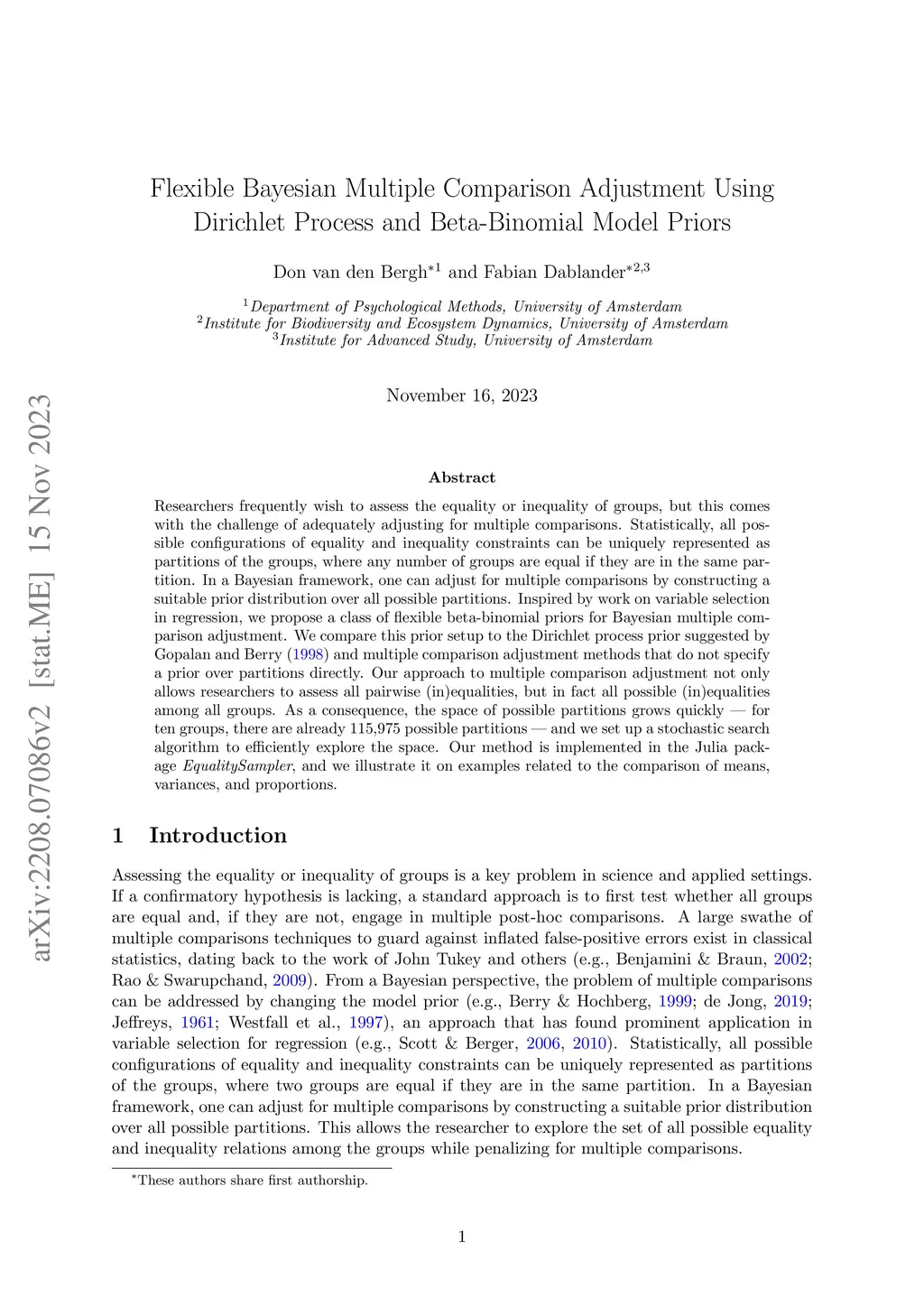 Researchers frequently wish to assess the equality or inequality of groups, but this comes with the challenge of adequately adjusting for multiple comparisons. Statistically, all possible configurations of equality and inequality constraints can be uniquely represented as partitions of the groups, where any number of groups are equal if they are in the same partition. In a Bayesian framework, one can adjust for multiple comparisons by constructing a suitable prior distribution over all possible partitions. Inspired by work on variable selection in regression, we propose a class of flexible beta-binomial priors for Bayesian multiple comparison adjustment. We compare this prior setup to the Dirichlet process prior suggested by Gopalan and Berry (1998) and multiple comparison adjustment methods that do not specify a prior over partitions directly. Our approach to multiple comparison adjustment not only allows researchers to assess all pairwise (in)equalities, but in fact all possible (in)equalities among all groups. As a consequence, the space of possible partitions grows quickly - for ten groups, there are already 115,975 possible partitions - and we set up a stochastic search algorithm to efficiently explore the space. Our method is implemented in the Julia package EqualitySampler, and we illustrate it on examples related to the comparison of means, variances, and proportions.