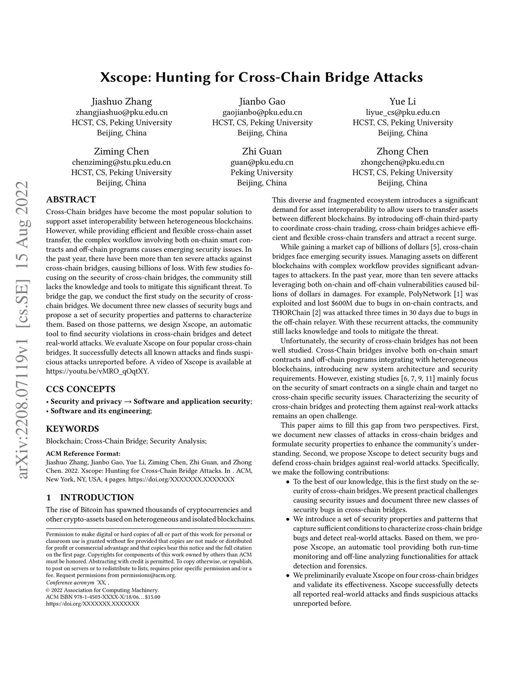 Cross-Chain bridges have become the most popular solution to support asset interoperability between heterogeneous blockchains. However, while providing efficient and flexible cross-chain asset transfer, the complex workflow involving both on-chain smart contracts and off-chain programs causes emerging security issues. In the past year, there have been more than ten severe attacks against cross-chain bridges, causing billions of loss. With few studies focusing on the security of cross-chain bridges, the community still lacks the knowledge and tools to mitigate this significant threat. To bridge the gap, we conduct the first study on the security of cross-chain bridges. We document three new classes of security bugs and propose a set of security properties and patterns to characterize them. Based on those patterns, we design Xscope, an automatic tool to find security violations in cross-chain bridges and detect real-world attacks. We evaluate Xscope on four popular cross-chain bridges. It successfully detects all known attacks and finds suspicious attacks unreported before. A video of Xscope is available at https://youtu.be/vMRO_qOqtXY.