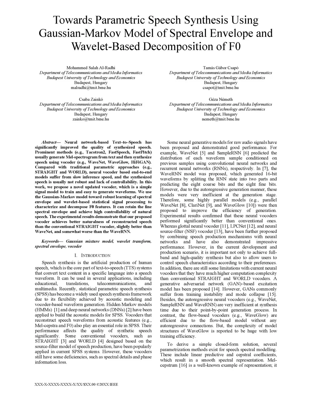 Neural network-based Text-to-Speech has significantly improved the quality of synthesized speech. Prominent methods (e.g., Tacotron2, FastSpeech, FastPitch) usually generate Mel-spectrogram from text and then synthesize speech using vocoder (e.g., WaveNet, WaveGlow, HiFiGAN). Compared with traditional parametric approaches (e.g., STRAIGHT and WORLD), neural vocoder based end-to-end models suffer from slow inference speed, and the synthesized speech is usually not robust and lack of controllability. In this work, we propose a novel updated vocoder, which is a simple signal model to train and easy to generate waveforms. We use the Gaussian-Markov model toward robust learning of spectral envelope and wavelet-based statistical signal processing to characterize and decompose F0 features. It can retain the fine spectral envelope and achieve high controllability of natural speech. The experimental results demonstrate that our proposed vocoder achieves better naturalness of reconstructed speech than the conventional STRAIGHT vocoder, slightly better than WaveNet, and somewhat worse than the WaveRNN.