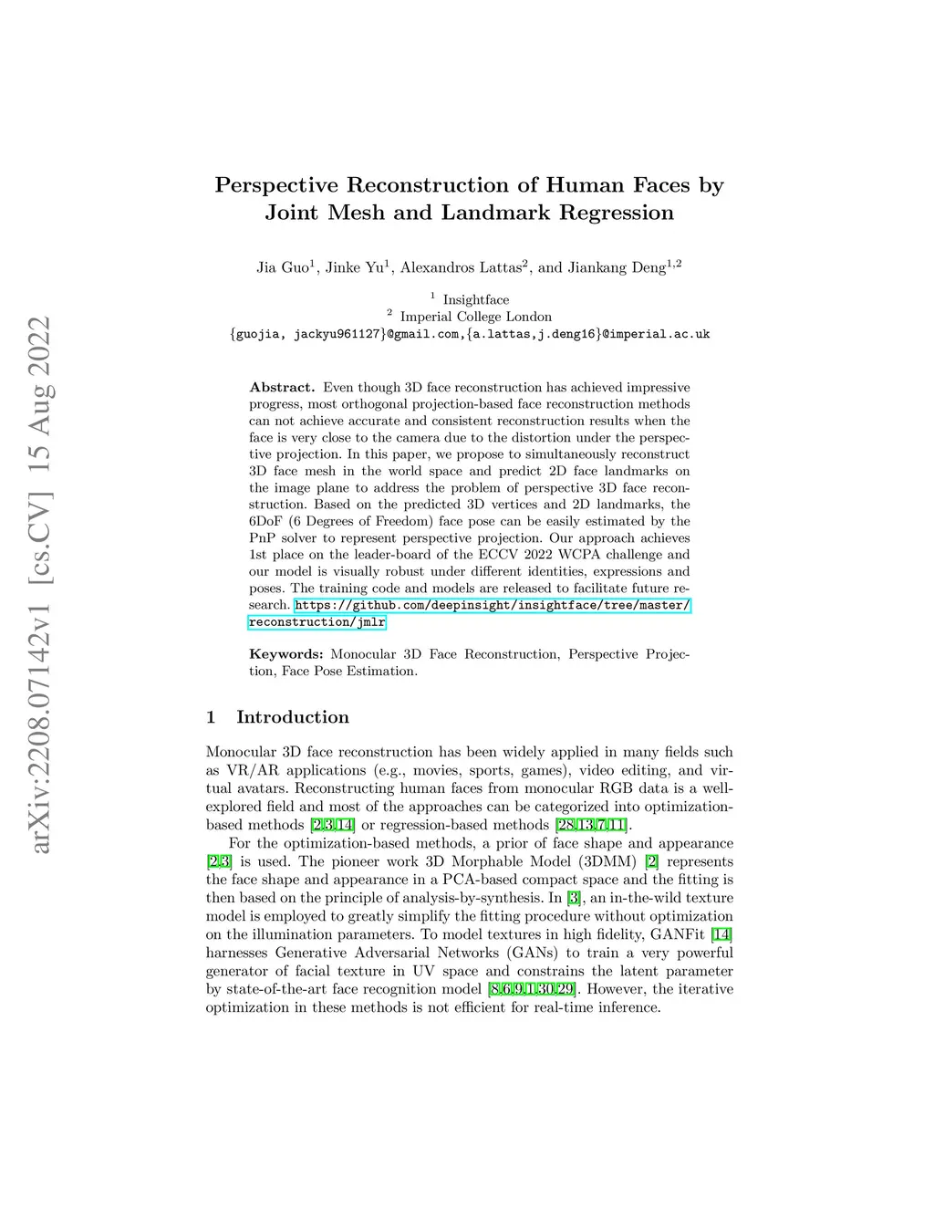 Perspective Reconstruction of Human Faces by Joint Mesh and Landmark