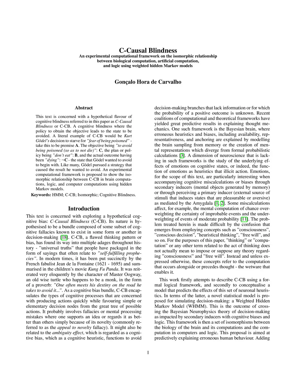 This text is concerned with a hypothetical flavour of cognitive blindness referred to in this paper as \textit{C-Causal Blindness} or C-CB. A cognitive blindness where the policy to obtain the objective leads to the state to be avoided. A literal example of C-CB would be \textit{Kurt Gödel's} decision to starve for \textit{"fear of being poisoned"} - take this to be premise \textbf{A}. The objective being \textit{"to avoid being poisoned (so as to not die)"}: \textbf{C}, the plan or policy being \textit{"don't eat"}: \textbf{B}, and the actual outcome having been \textit{"dying"}: \textbf{C} - the state that Gödel wanted to avoid to begin with. Gödel pursued a strategy that caused the result he wanted to avoid. An experimental computational framework is proposed to show the isomorphic relationship between C-CB in brain computations, logic, and computer computations using a new proposed algorithm: a Weighted Hidden Markov Model.