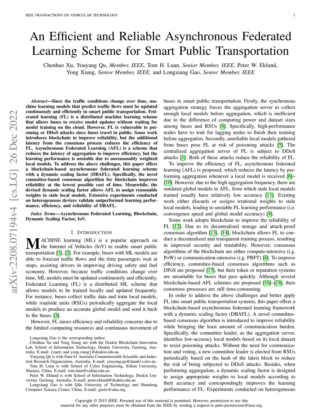 Since the traffic conditions change over time, machine learning models that predict traffic flows must be updated continuously and efficiently in smart public transportation. Federated learning (FL) is a distributed machine learning scheme that allows buses to receive model updates without waiting for model training on the cloud. However, FL is vulnerable to poisoning or DDoS attacks since buses travel in public. Some work introduces blockchain to improve reliability, but the additional latency from the consensus process reduces the efficiency of FL. Asynchronous Federated Learning (AFL) is a scheme that reduces the latency of aggregation to improve efficiency, but the learning performance is unstable due to unreasonably weighted local models. To address the above challenges, this paper offers a blockchain-based asynchronous federated learning scheme with a dynamic scaling factor (DBAFL). Specifically, the novel committee-based consensus algorithm for blockchain improves reliability at the lowest possible cost of time. Meanwhile, the devised dynamic scaling factor allows AFL to assign reasonable weights to stale local models. Extensive experiments conducted on heterogeneous devices validate outperformed learning performance, efficiency, and reliability of DBAFL.