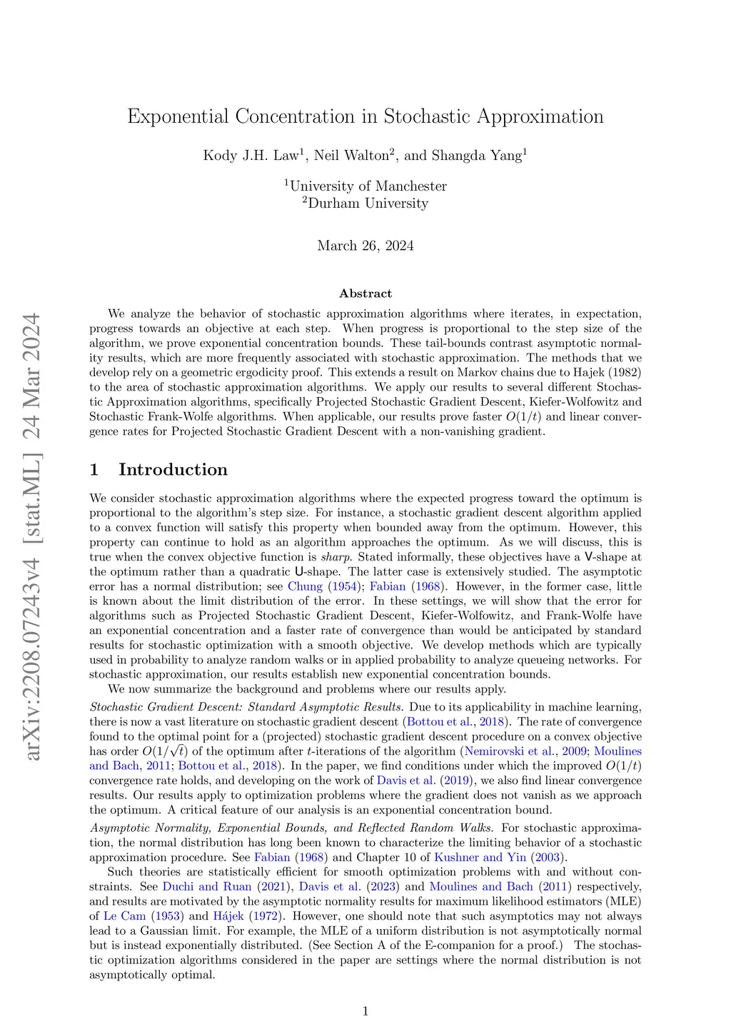 We analyze the behavior of stochastic approximation algorithms where iterates, in expectation, progress towards an objective at each step. When progress is proportional to the step size of the algorithm, we prove exponential concentration bounds. These tail-bounds contrast asymptotic normality results, which are more frequently associated with stochastic approximation. The methods that we develop rely on a geometric ergodicity proof. This extends a result on Markov chains due to Hajek (1982) to the area of stochastic approximation algorithms. We apply our results to several different Stochastic Approximation algorithms, specifically Projected Stochastic Gradient Descent, Kiefer-Wolfowitz and Stochastic Frank-Wolfe algorithms. When applicable, our results prove faster and linear convergence rates for Projected Stochastic Gradient Descent with a non-vanishing gradient.