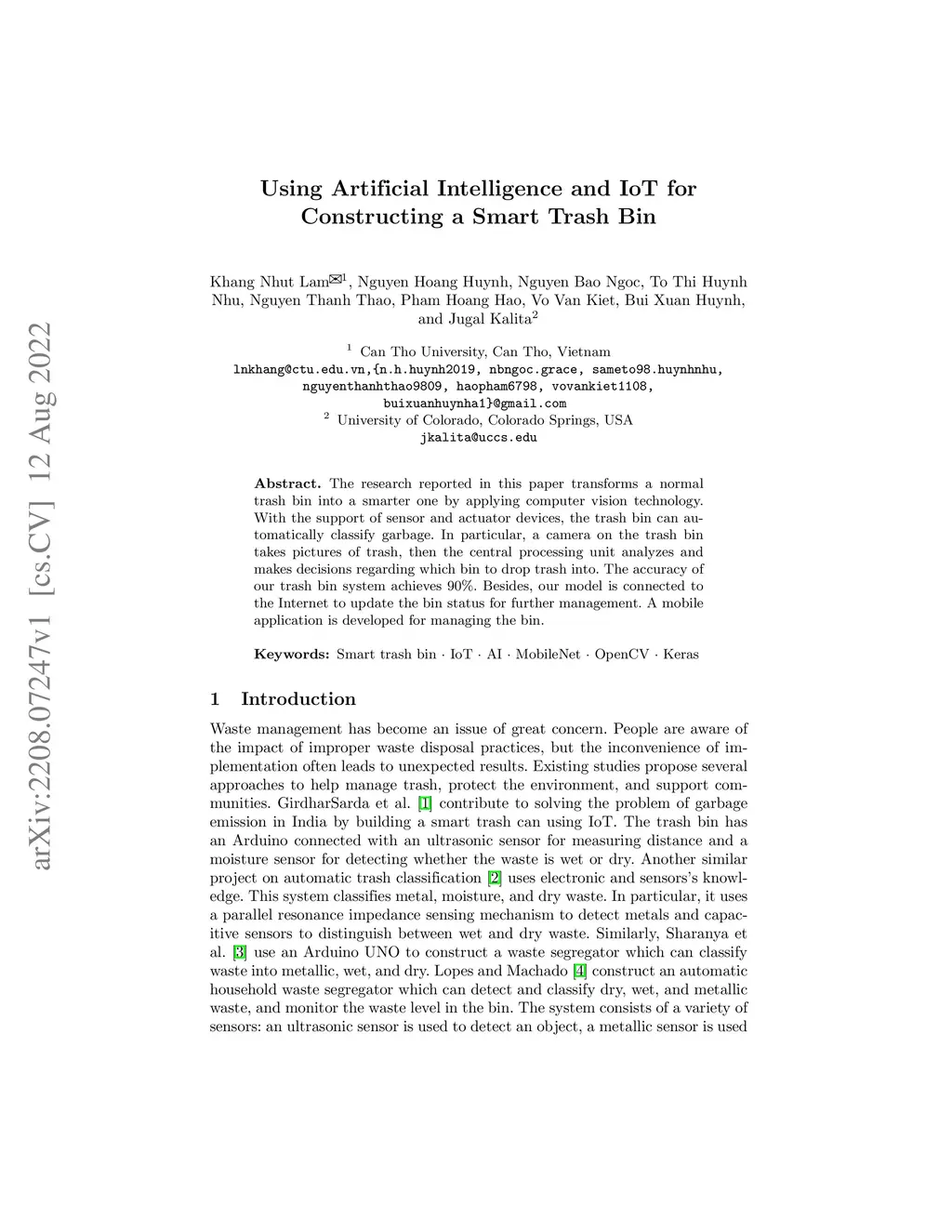 The research reported in this paper transforms a normal trash bin into a smarter one by applying computer vision technology. With the support of sensors and actuator devices, the trash bin can automatically classify garbage. In particular, a camera on the trash bin takes pictures of trash, then the central processing unit analyzes and makes decisions regarding which bin to drop trash into. The accuracy of our trash bin system achieves 90%. Besides, our model is connected to the Internet to update the bin status for further management. A mobile application is developed for managing the bin.