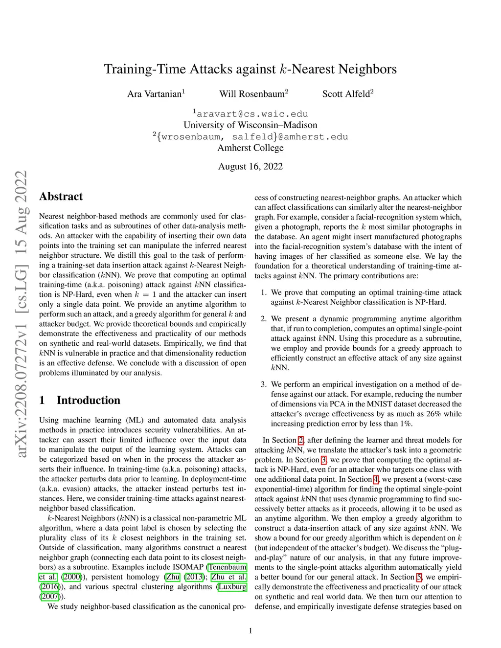 Nearest neighbor-based methods are commonly used for classification tasks and as subroutines of other data-analysis methods. An attacker with the capability of inserting their own data points into the training set can manipulate the inferred nearest neighbor structure. We distill this goal to the task of performing a training-set data insertion attack against -Nearest Neighbor classification (NN). We prove that computing an optimal training-time (a.k.a. poisoning) attack against NN classification is NP-Hard, even when and the attacker can insert only a single data point. We provide an anytime algorithm to perform such an attack, and a greedy algorithm for general and attacker budget. We provide theoretical bounds and empirically demonstrate the effectiveness and practicality of our methods on synthetic and real-world datasets. Empirically, we find that NN is vulnerable in practice and that dimensionality reduction is an effective defense. We conclude with a discussion of open problems illuminated by our analysis.