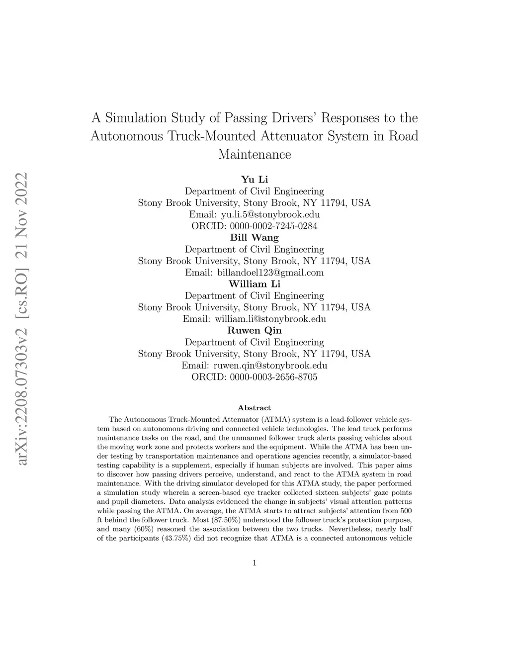 The Autonomous Truck-Mounted Attenuator (ATMA) system is a lead-follower vehicle system based on autonomous driving and connected vehicle technologies. The lead truck performs maintenance tasks on the road, and the unmanned follower truck alerts passing vehicles about the moving work zone and protects workers and the equipment. While the ATMA has been under testing by transportation maintenance and operations agencies recently, a simulator-based testing capability is a supplement, especially if human subjects are involved. This paper aims to discover how passing drivers perceive, understand, and react to the ATMA system in road maintenance. With the driving simulator developed for this ATMA study, the paper performed a simulation study wherein a screen-based eye tracker collected sixteen subjects' gaze points and pupil diameters. Data analysis evidenced the change in subjects' visual attention patterns while passing the ATMA. On average, the ATMA starts to attract subjects' attention from 500 ft behind the follower truck. Most (87.50%) understood the follower truck's protection purpose, and many (60%) reasoned the association between the two trucks. Nevertheless, nearly half of the participants (43.75%) did not recognize that ATMA is a connected autonomous vehicle system. While all subjects safely changed lanes and attempted to pass the slow-moving ATMA, their inadequate understanding of the ATMA is a potential risk, like cutting into the ATAM. Results implied that transportation maintenance and operations agencies should consider this in establishing the deployment guidance.