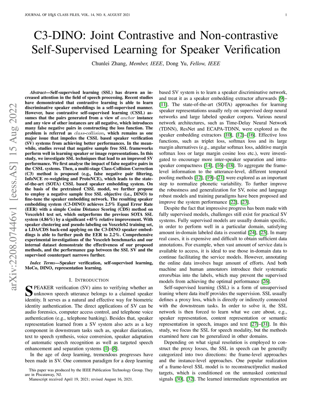 Self-supervised learning (SSL) has drawn an increased attention in the field of speech processing. Recent studies have demonstrated that contrastive learning is able to learn discriminative speaker embeddings in a self-supervised manner. However, base contrastive self-supervised learning (CSSL) assumes that the pairs generated from a view of anchor instance and any view of other instances are all negative, which introduces many false negative pairs in constructing the loss function. The problem is referred as -, which remains as one major issue that impedes the CSSL based speaker verification (SV) systems from achieving better performances. In the meanwhile, studies reveal that negative sample free SSL frameworks perform well in learning speaker or image representations. In this study, we investigate SSL techniques that lead to an improved SV performance. We first analyse the impact of false negative pairs in the CSSL systems. Then, a multi-stage Class-Collision Correction (C3) method is proposed, which leads to the state-of-the-art CSSL based speaker embedding system. On the basis of the pretrained CSSL model, we further propose to employ a negative sample free SSL objective (i.e., DINO) to fine-tune the speaker embedding network. The resulting speaker embedding system (C3-DINO) achieves 2.5% EER with a simple Cosine Distance Scoring method on Voxceleb1 test set, which outperforms the previous SOTA SSL system (4.86%) by a significant +45% relative improvement. With speaker clustering and pseudo labeling on Voxceleb2 training set, a LDA/CDS back-end applying on the C3-DINO speaker embeddings is able to further push the EER to 2.2%. Comprehensive experimental investigations of the Voxceleb benchmarks and our internal dataset demonstrate the effectiveness of our proposed methods, and the performance gap between the SSL SV and the supervised counterpart narrows further.