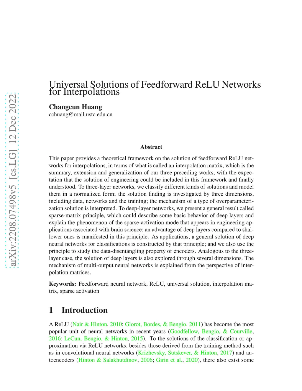 This paper provides a theoretical framework on the solution of feedforward ReLU networks for interpolations, in terms of what is called an interpolation matrix, which is the summary, extension and generalization of our three preceding works, with the expectation that the solution of engineering could be included in this framework and finally understood. To three-layer networks, we classify different kinds of solutions and model them in a normalized form; the solution finding is investigated by three dimensions, including data, networks and the training; the mechanism of a type of overparameterization solution is interpreted. To deep-layer networks, we present a general result called sparse-matrix principle, which could describe some basic behavior of deep layers and explain the phenomenon of the sparse-activation mode that appears in engineering applications associated with brain science; an advantage of deep layers compared to shallower ones is manifested in this principle. As applications, a general solution of deep neural networks for classifications is constructed by that principle; and we also use the principle to study the data-disentangling property of encoders. Analogous to the three-layer case, the solution of deep layers is also explored through several dimensions. The mechanism of multi-output neural networks is explained from the perspective of interpolation matrices.