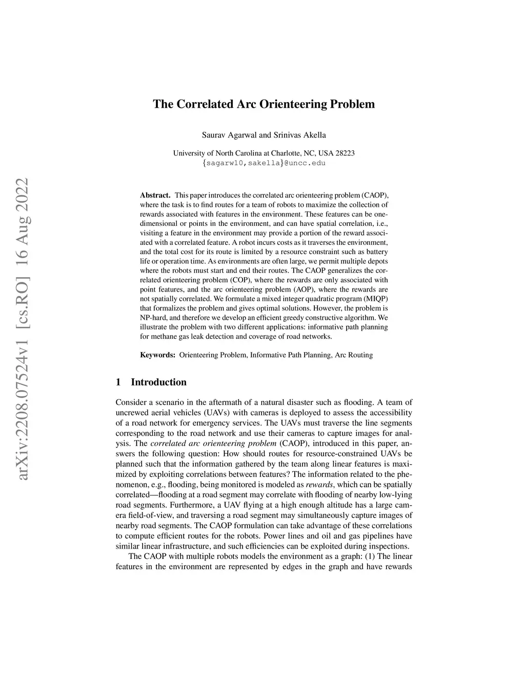 This paper introduces the correlated arc orienteering problem (CAOP), where the task is to find routes for a team of robots to maximize the collection of rewards associated with features in the environment. These features can be one-dimensional or points in the environment, and can have spatial correlation, i.e., visiting a feature in the environment may provide a portion of the reward associated with a correlated feature. A robot incurs costs as it traverses the environment, and the total cost for its route is limited by a resource constraint such as battery life or operation time. As environments are often large, we permit multiple depots where the robots must start and end their routes. The CAOP generalizes the correlated orienteering problem (COP), where the rewards are only associated with point features, and the arc orienteering problem (AOP), where the rewards are not spatially correlated. We formulate a mixed integer quadratic program (MIQP) that formalizes the problem and gives optimal solutions. However, the problem is NP-hard, and therefore we develop an efficient greedy constructive algorithm. We illustrate the problem with two different applications: informative path planning for methane gas leak detection and coverage of road networks.