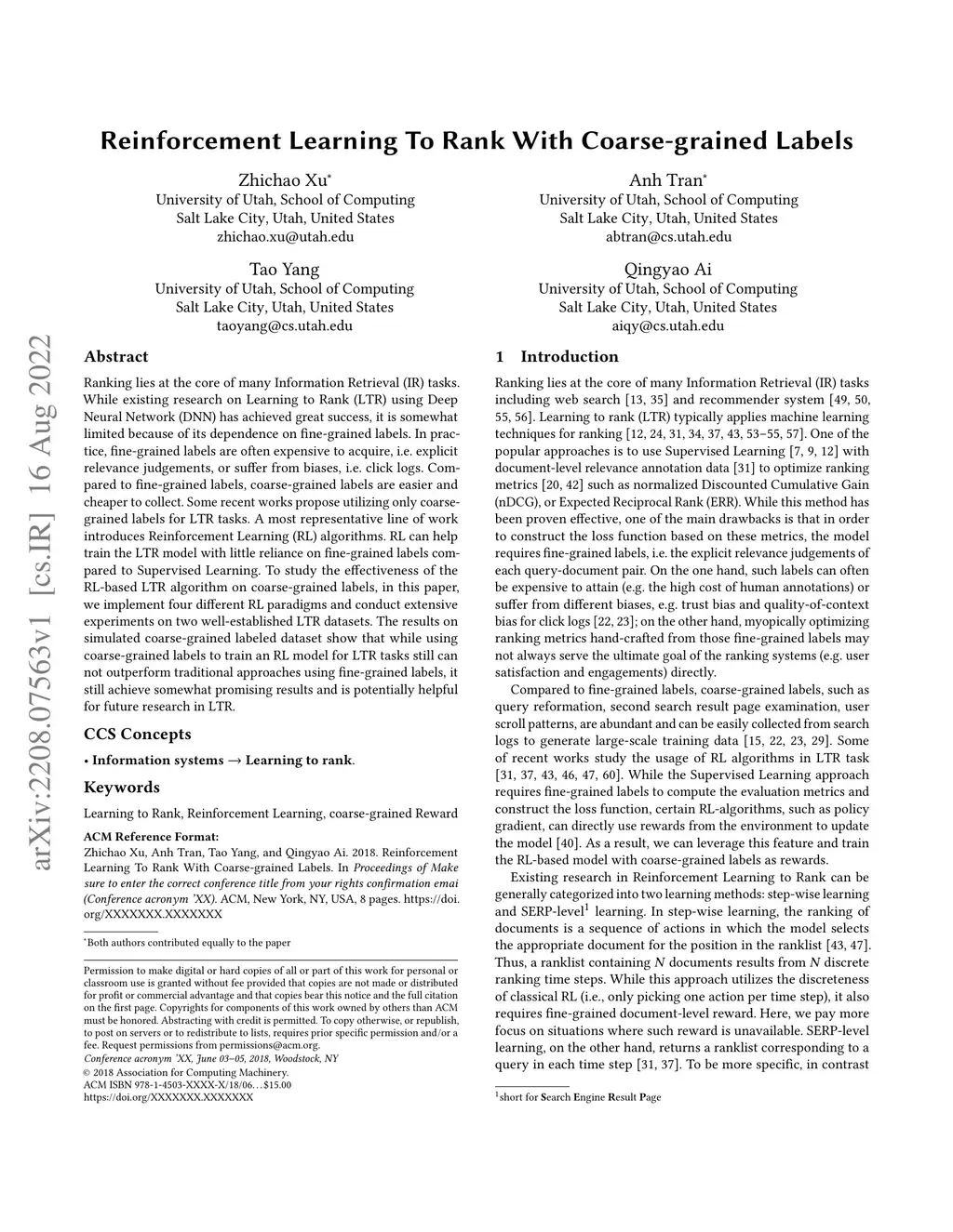 Reinforcement Learning to Rank Using Coarse-grained Rewards