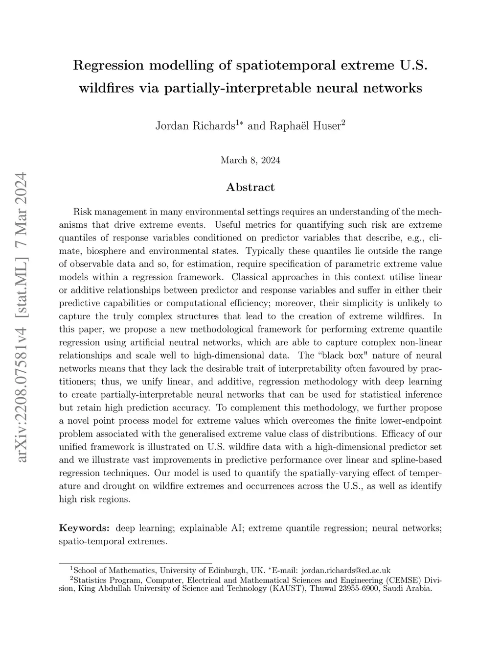 Risk management in many environmental settings requires an understanding of the mechanisms that drive extreme events. Useful metrics for quantifying such risk are extreme quantiles of response variables conditioned on predictor variables that describe, e.g., climate, biosphere and environmental states. Typically these quantiles lie outside the range of observable data and so, for estimation, require specification of parametric extreme value models within a regression framework. Classical approaches in this context utilise linear or additive relationships between predictor and response variables and suffer in either their predictive capabilities or computational efficiency; moreover, their simplicity is unlikely to capture the truly complex structures that lead to the creation of extreme wildfires. In this paper, we propose a new methodological framework for performing extreme quantile regression using artificial neutral networks, which are able to capture complex non-linear relationships and scale well to high-dimensional data. The "black box" nature of neural networks means that they lack the desirable trait of interpretability often favoured by practitioners; thus, we unify linear, and additive, regression methodology with deep learning to create partially-interpretable neural networks that can be used for statistical inference but retain high prediction accuracy. To complement this methodology, we further propose a novel point process model for extreme values which overcomes the finite lower-endpoint problem associated with the generalised extreme value class of distributions. Efficacy of our unified framework is illustrated on U.S. wildfire data with a high-dimensional predictor set and we illustrate vast improvements in predictive performance over linear and spline-based regression techniques.
