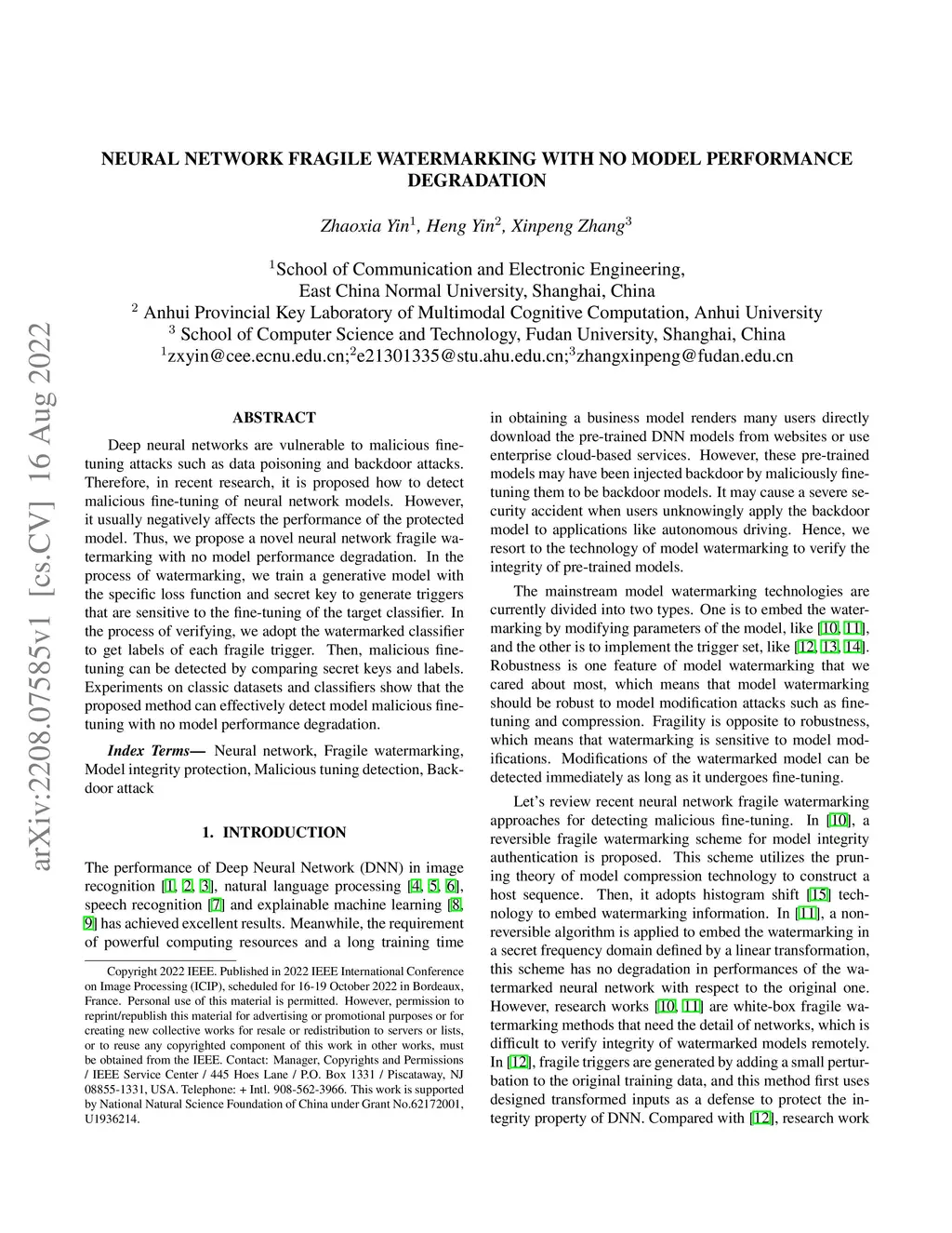 Neural network fragile watermarking with no model performance