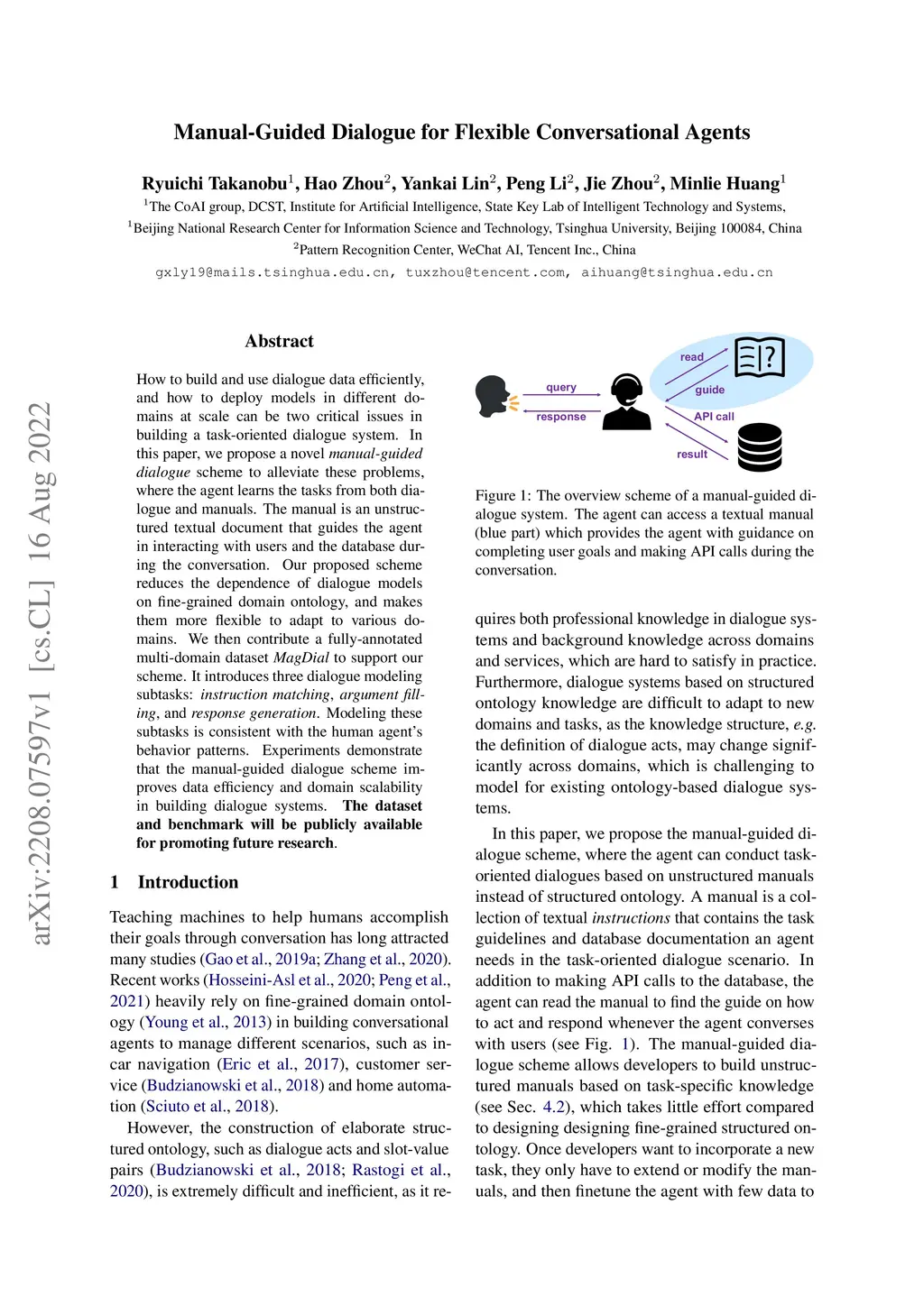 How to build and use dialogue data efficiently, and how to deploy models in different domains at scale can be two critical issues in building a task-oriented dialogue system. In this paper, we propose a novel manual-guided dialogue scheme to alleviate these problems, where the agent learns the tasks from both dialogue and manuals. The manual is an unstructured textual document that guides the agent in interacting with users and the database during the conversation. Our proposed scheme reduces the dependence of dialogue models on fine-grained domain ontology, and makes them more flexible to adapt to various domains. We then contribute a fully-annotated multi-domain dataset MagDial to support our scheme. It introduces three dialogue modeling subtasks: instruction matching, argument filling, and response generation. Modeling these subtasks is consistent with the human agent's behavior patterns. Experiments demonstrate that the manual-guided dialogue scheme improves data efficiency and domain scalability in building dialogue systems. The dataset and benchmark will be publicly available for promoting future research.