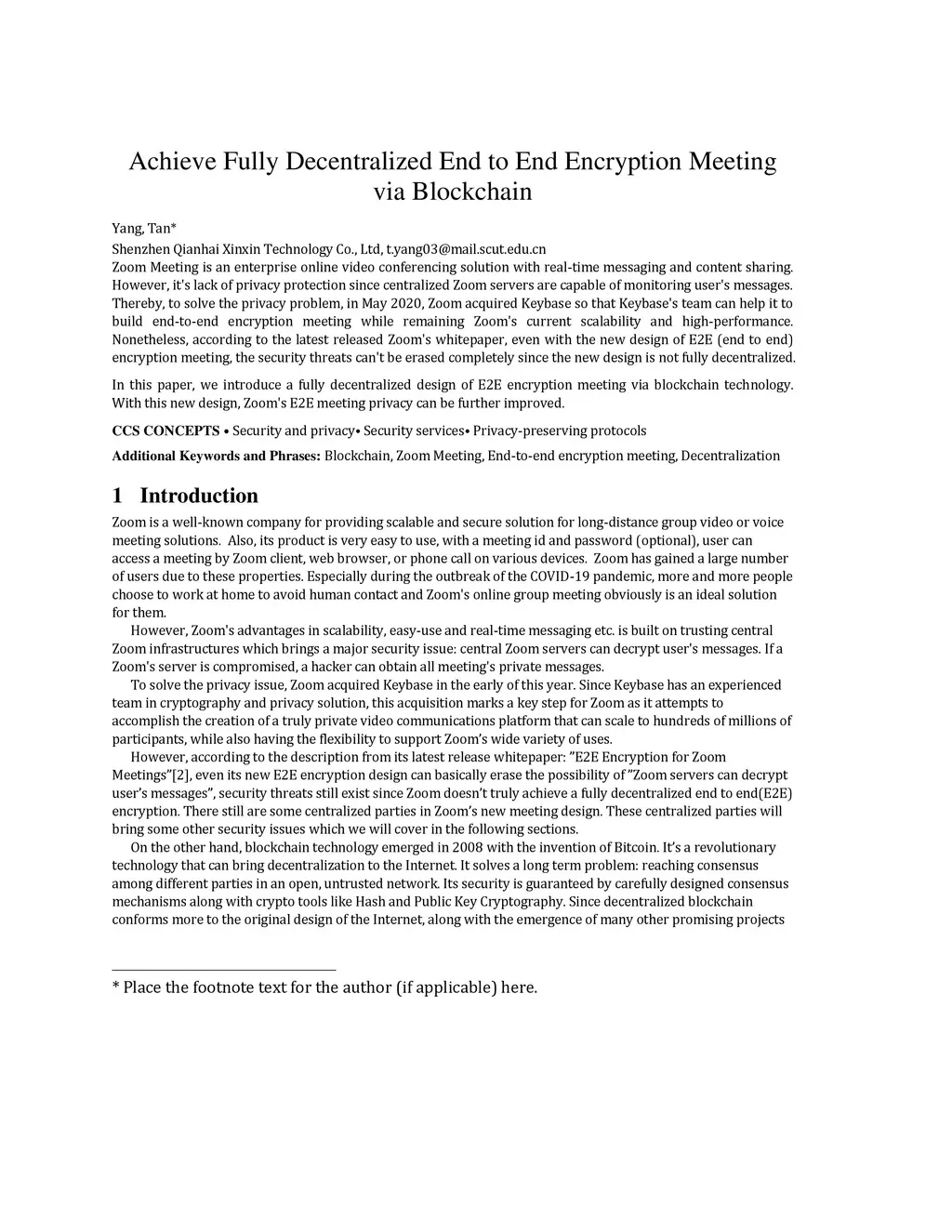 Zoom Meeting is an enterprise online video conferencing solution with real-time messaging and content sharing. However, it's lack of privacy protection since centralized Zoom servers are capable of monitoring user's messages. Thereby, to solve the privacy problem, in May 2020, Zoom acquired Keybase so that Keybase's team can help it to build end-to-end encryption meeting while remaining Zoom's current scalability and high-performance. Nonetheless, according to the latest released Zoom's whitepaper, even with the new design of E2E (end to end) encryption meeting, the security threats can't be erased completely since the new design is not fully decentralized. In this paper, we introduce a fully decentralized design of E2E encryption meeting via blockchain technology. With this new design, Zoom's E2E meeting privacy can be further improved.