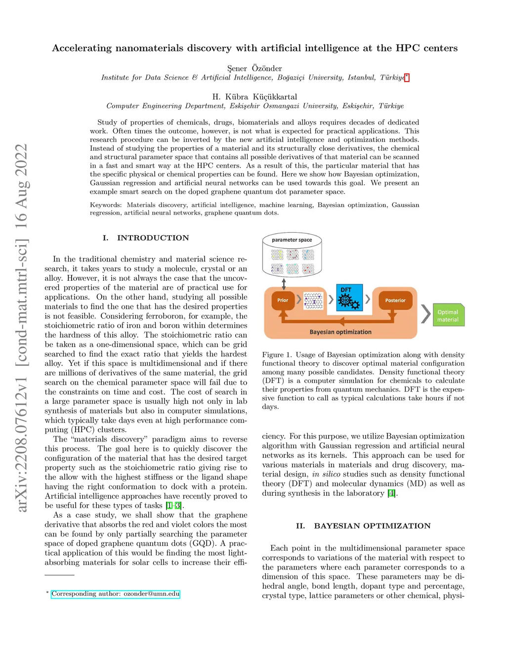 Study of properties of chemicals, drugs, biomaterials and alloys requires decades of dedicated work. Often times the outcome, however, is not what is expected for practical applications. This research procedure can be inverted by the new artificial intelligence and optimization methods. Instead of studying the properties of a material and its structurally close derivatives, the chemical and structural parameter space that contains all possible derivatives of that material can be scanned in a fast and smart way at the HPC centers. As a result of this, the particular material that has the specific physical or chemical properties can be found. Here we show how Bayesian optimization, Gaussian regression and artificial neural networks can be used towards this goal. We present an example smart search on the doped graphene quantum dot parameter space.