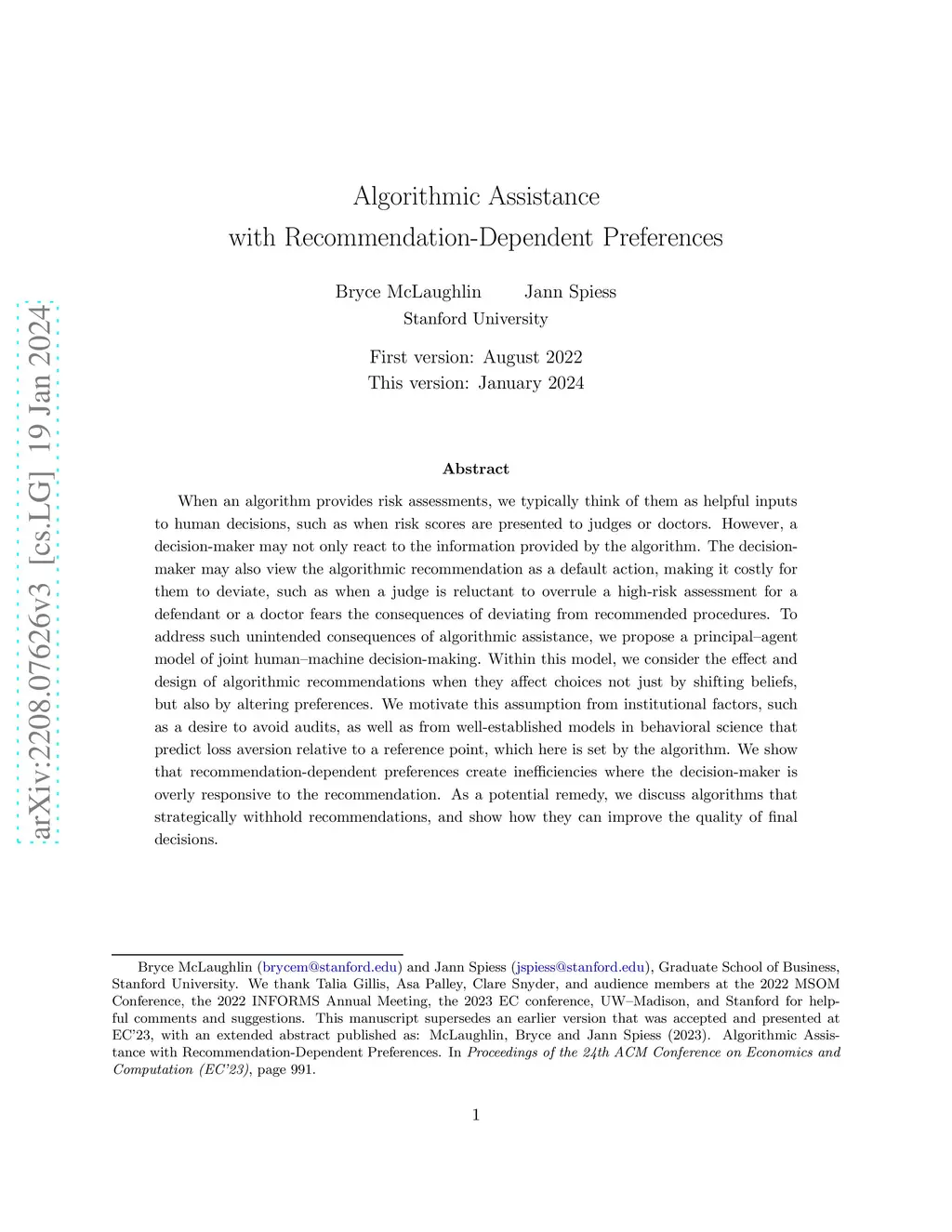 When an algorithm provides risk assessments, we typically think of them as helpful inputs to human decisions, such as when risk scores are presented to judges or doctors. However, a decision-maker may react not only to the information provided by the algorithm. The decision-maker may also view the algorithmic recommendation as a default action, making it costly for them to deviate, such as when a judge is reluctant to overrule a high-risk assessment for a defendant or a doctor fears the consequences of deviating from recommended procedures. To address such unintended consequences of algorithmic assistance, we propose a model of joint human-machine decision-making. Within this model, we consider the effect and design of algorithmic recommendations when they affect choices not just by shifting beliefs, but also by altering preferences. We motivate this assumption from institutional factors, such as a desire to avoid audits, as well as from well-established models in behavioral science that predict loss aversion relative to a reference point. We show that recommendation-dependent preferences create inefficiencies where the decision-maker is overly responsive to the recommendation. As a remedy, we discuss algorithms that strategically withhold recommendations and show how they can improve the quality of final decisions. Concretely, we prove that an intuitive algorithm achieves minimax optimality by sending recommendations only when it is confident that their implementation would improve over an unassisted baseline decision.