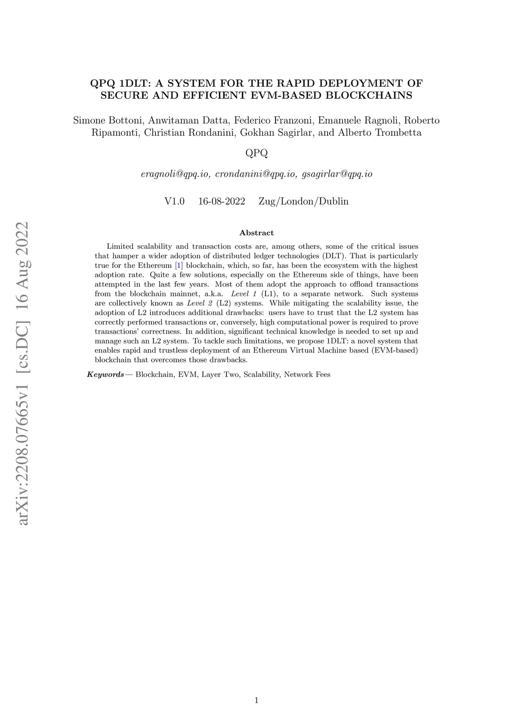 Limited scalability and transaction costs are, among others, some of the critical issues that hamper a wider adoption of distributed ledger technologies (DLT). That is particularly true for the Ethereum blockchain, which, so far, has been the ecosystem with the highest adoption rate. Quite a few solutions, especially on the Ethereum side of things, have been attempted in the last few years. Most of them adopt the approach to offload transactions from the blockchain mainnet, a.k.a. Level 1 (L1), to a separate network. Such systems are collectively known as Level 2 (L2) systems. While mitigating the scalability issue, the adoption of L2 introduces additional drawbacks: users have to trust that the L2 system has correctly performed transactions or, conversely, high computational power is required to prove transactions correctness. In addition, significant technical knowledge is needed to set up and manage such an L2 system. To tackle such limitations, we propose 1DLT: a novel system that enables rapid and trustless deployment of an Ethereum Virtual Machine based blockchain that overcomes those drawbacks.